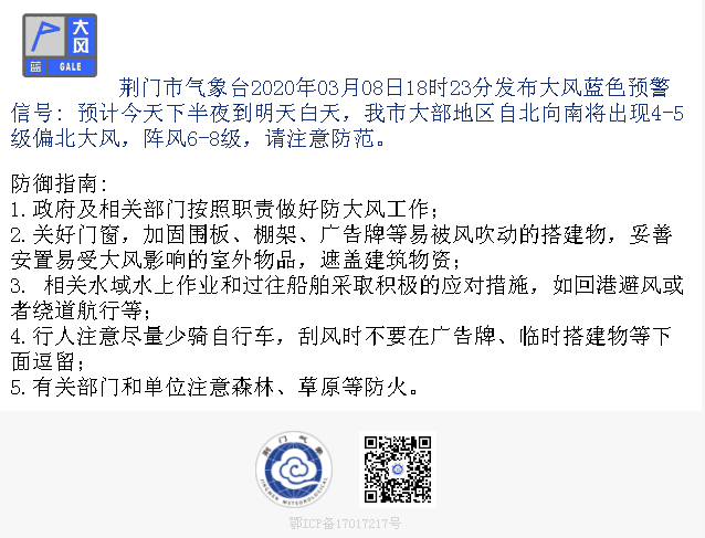 荆门市气象台2020年03月08日18时23分发布大风蓝色预警信号: 预计今天下半夜到明天白天,我市大部地区自北向南将出现4-5级偏北大风,阵风6-8级,请注意防范。
