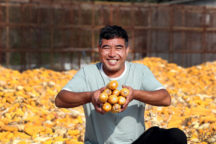 9月22日,在河南焦作博爱县磨头镇崔庄村,“70后”崔卫民展示今年丰收的玉米。新华社发(程全 摄)
