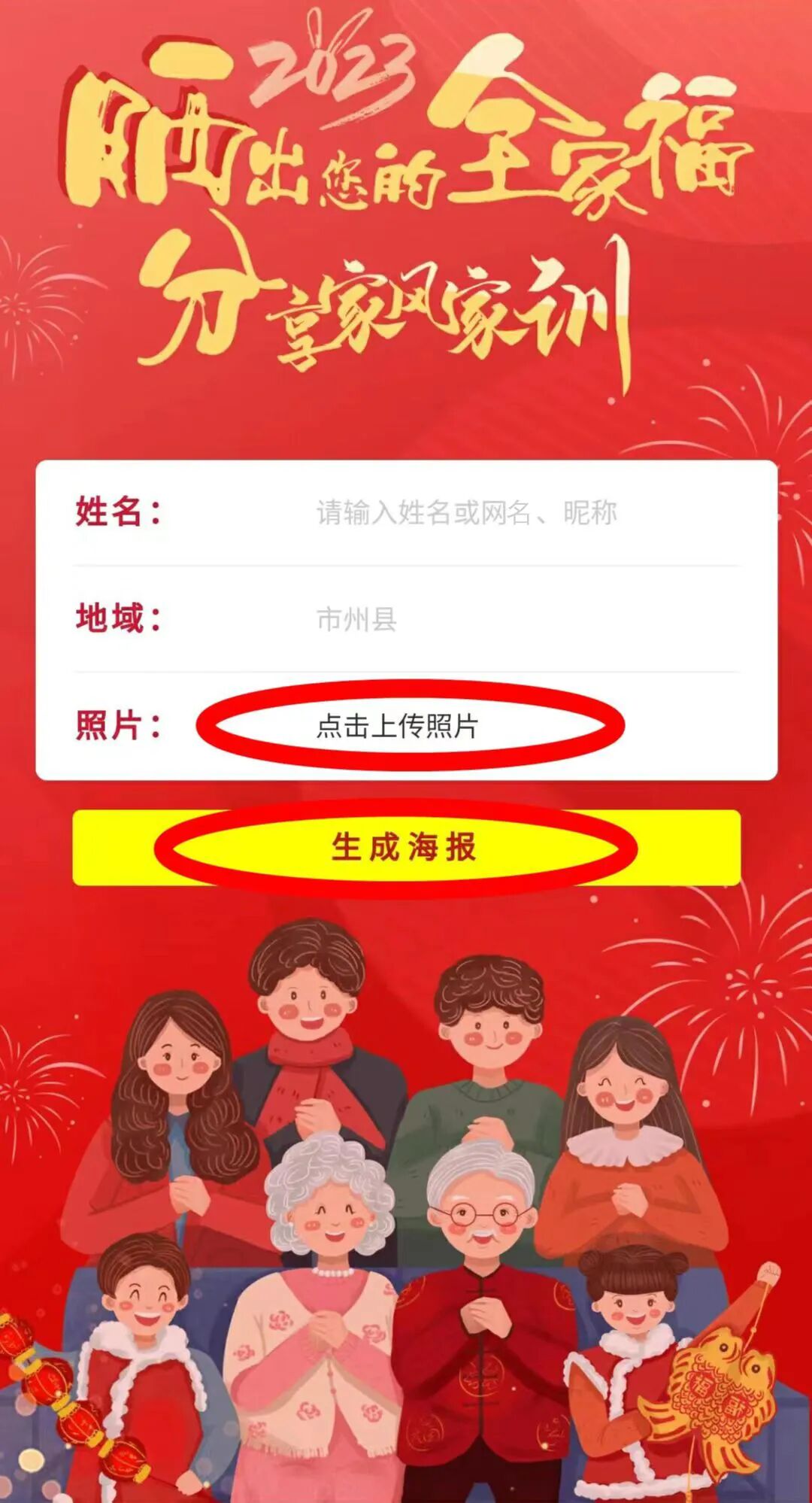 面向全省家庭,号召大家积极参与“晒出您的全家福,分享家风家训”线上活动。广大网友通过随机抽取新年愿望,可上传中华人民共和国成立后,反映幸福生活的全家福老照片或具有纪念意义、保存价值的家庭成员老照片,激活大众的时代记忆、家国情怀;也可上传近年来普通家庭体现幸福家庭浓浓情感的全家福,生成含有家风家训的专属海报,将优良家风传承下去,留下新年美好记忆。