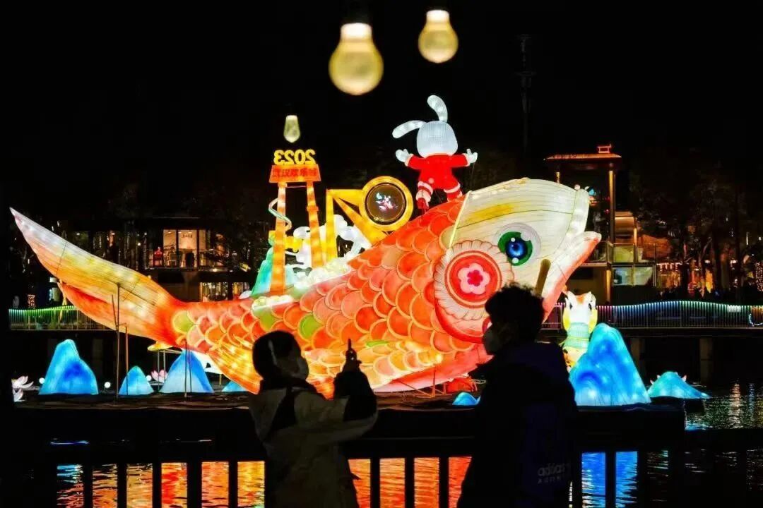 游客们结伴而行,在东湖迎春大鱼灯会度过兔年新春第一天。记者何晓刚 摄