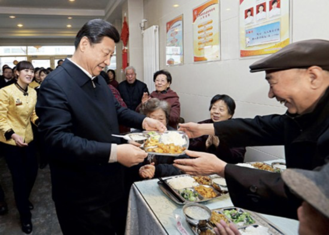 2013年2月4日,习近平来到兰州一家养老餐厅,端上一盘热气腾腾的饭菜,送到一位老人面前。新华社记者 兰红光 摄
