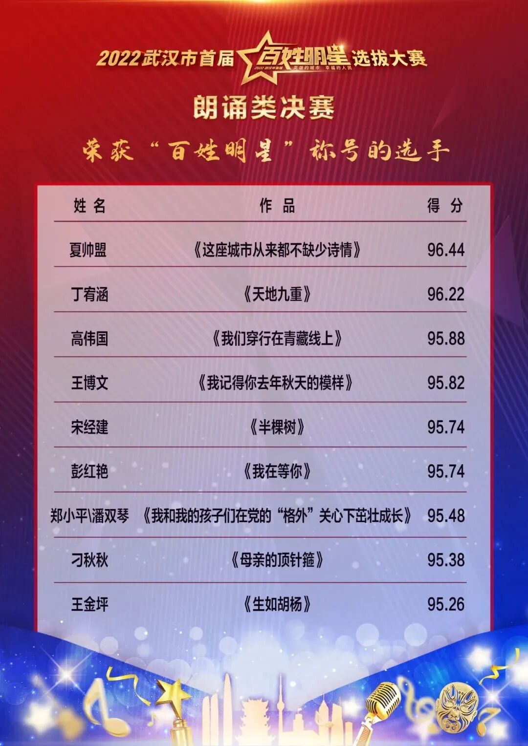 经过严格筛选、层层选拔,本次选拔大赛朗诵类决赛集结号在武汉市江汉区文化馆吹响。最终,9名选手脱颖而出,荣获“百姓明星”称号。