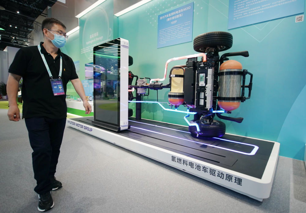 在论坛展区,现代汽车氢燃料电池车的展示用切割车配合电子屏幕,直观呈现氢燃料电池的驱动原理。
