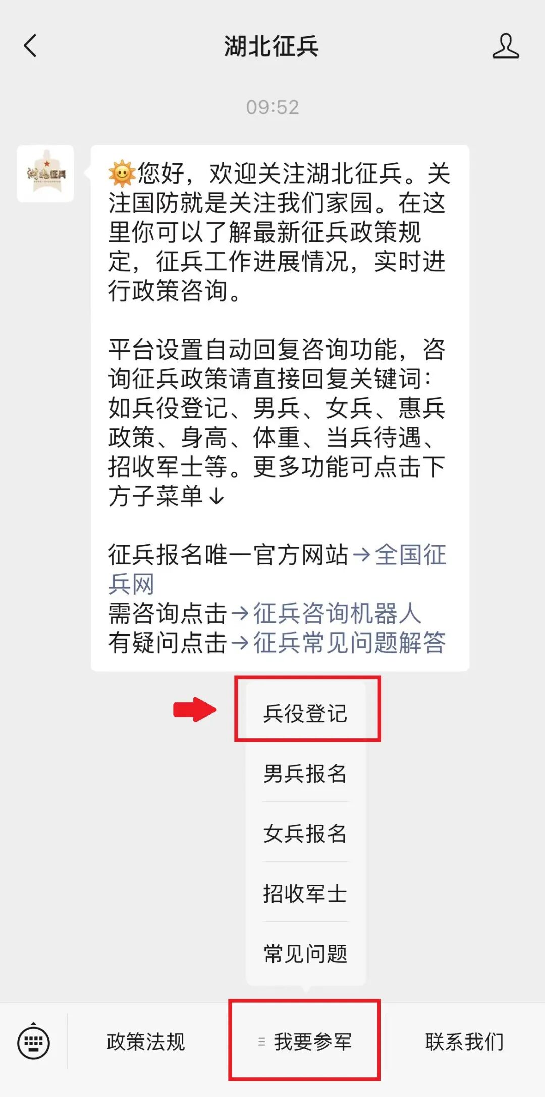 ①关注“湖北征兵”微信公众号,点击“我要参军”进入“兵役登记”页面: