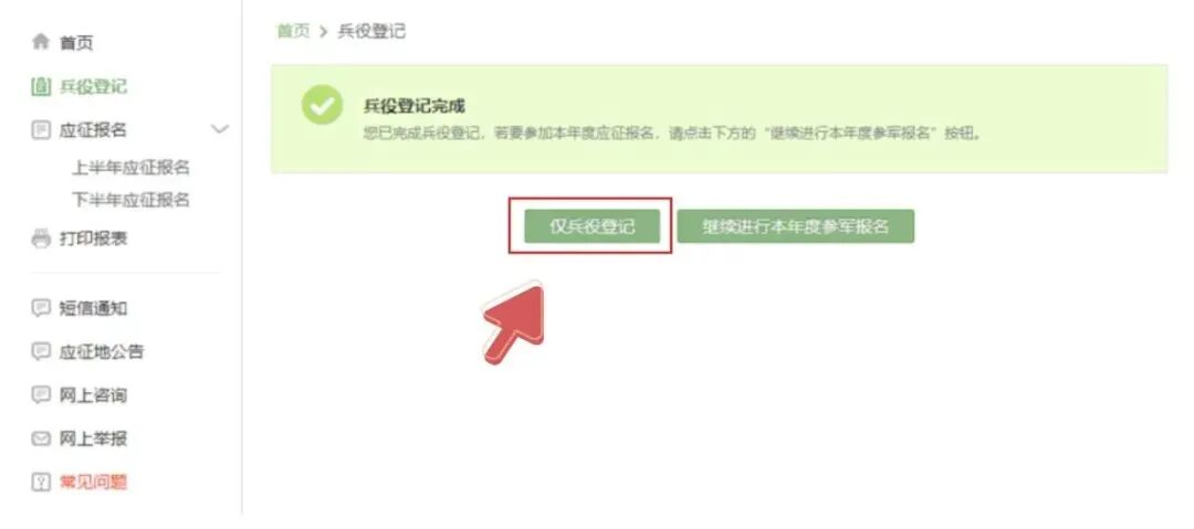 如果今年不想参军,只进行兵役登记,在网上兵役登记时最后一步选择“仅兵役登记”,登记完成后下载打印《男性公民兵役登记表/报名登记表》交本人到所在地乡镇(街道、社区)人武部或其他指定地点,即可办理《兵役登记证》。