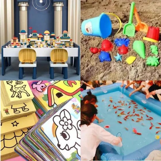 亲子玩乐区设计4大项目,趣味搭积木、欢乐捞金鱼、创意彩绘、沙中寻宝,都是时下火爆娃圈的游戏。