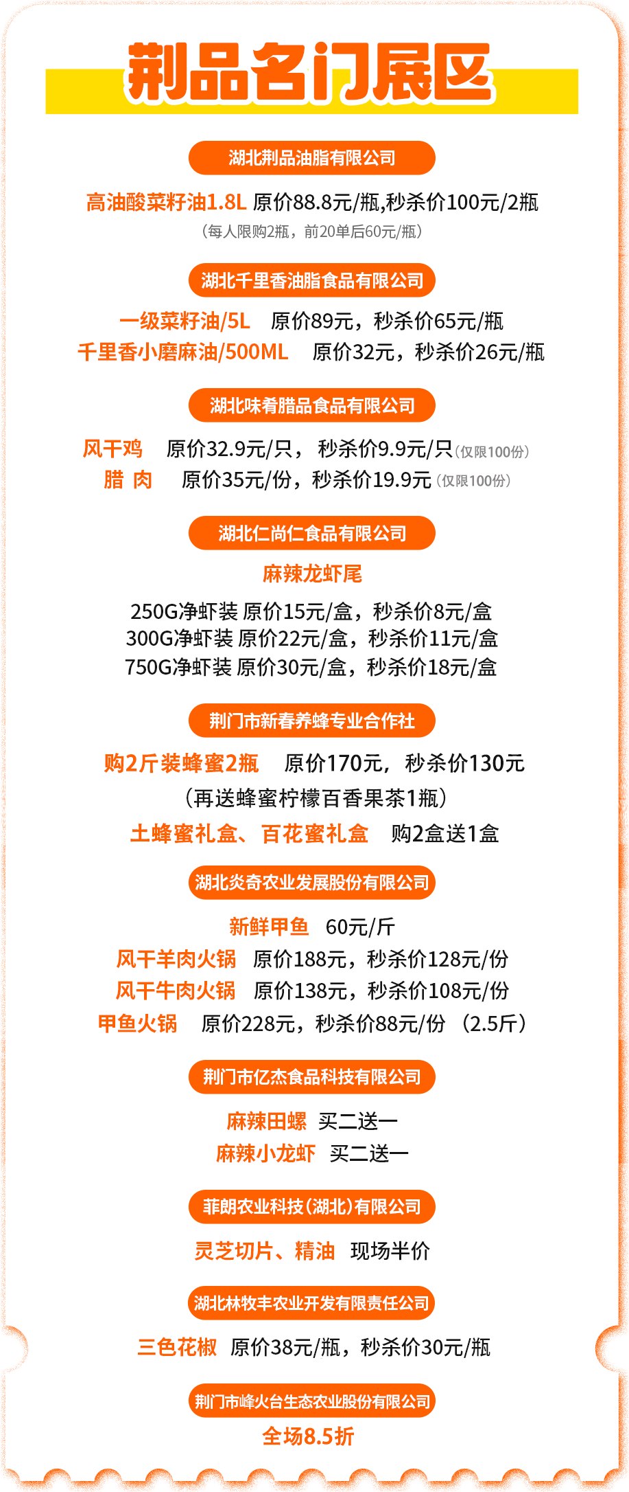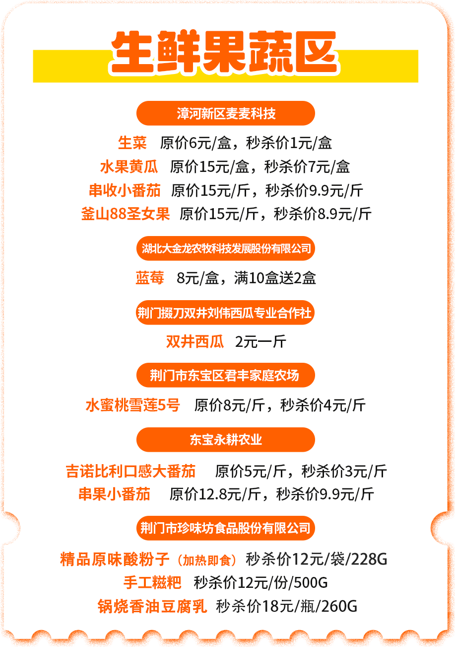 展区近50家商户,有荆门传统风味品牌,本土创业代表品牌,囊括了荆门出圈农副产品、本地网红休闲美食、应季生鲜蔬果等。咱主打的就是一个【荆门特色】。