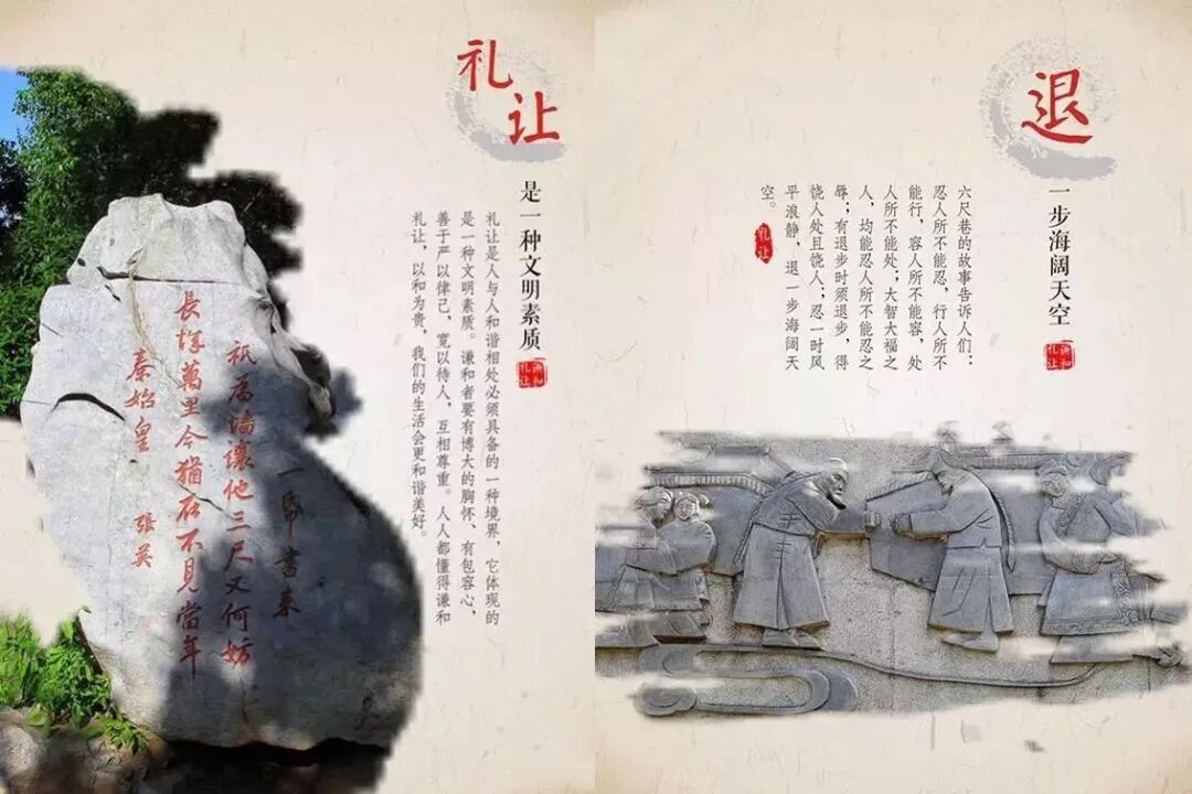 “千里修书只为墙,让他三尺又何妨。”这首“让墙诗”出自六尺巷的典故。史料记载:“张文瑞公居宅旁有隙地,与吴氏邻,吴氏越用之。家人驰书于都,公批书于后寄归。家人得书,遂撤让三尺,故六尺巷遂以为名焉。”这个典故记录了古人和睦谦让的美德,是邻里之间互相礼让的典范。