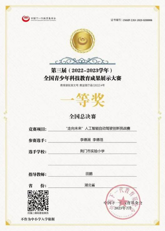 7月29日,第三届全国青少年科技教育成果展示大赛总决赛在北京举行。荆门市实验小学的两支代表队参加“走向未来”人工智能自动驾驶创新挑战赛项目,均取得优异成绩。其中,由李德澜、李德湉组成的未来队获得全国总决赛亚军,由罗智楷、姚振远组成的创想队获得全国总决赛一等奖。