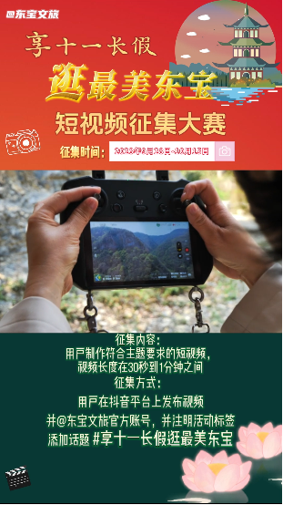 活动内容:拍摄一段展示美丽东宝的短视频,带上话题#享十一长假逛最美东宝并@东宝文旅,同时发布到抖音,即可参加比赛。可以邀请并分享你的亲友们一起观看为你点赞转发。我们将根据主题符合度、内容质量、创意性和互动性评选出优秀作品,并送上丰富奖励。