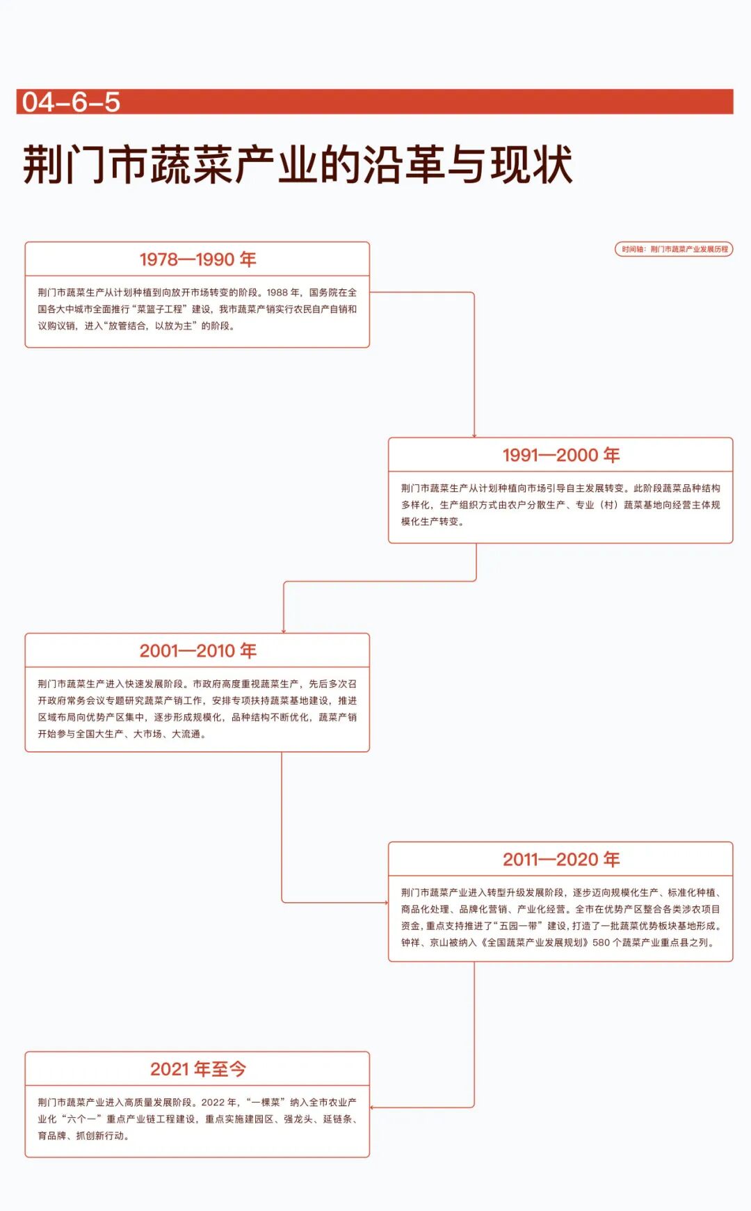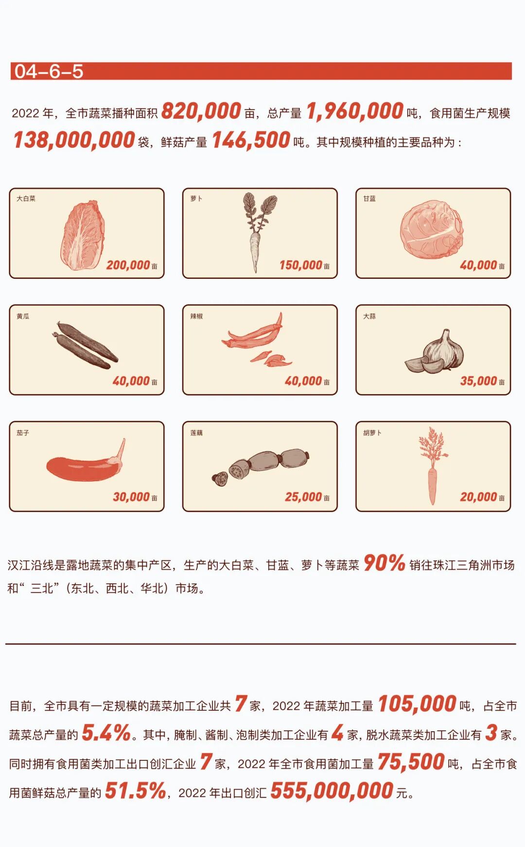 荆门市蔬菜播种面积83万亩以上,蔬菜总产量突破200万吨;食用菌生产规模达1.4亿袋,食用菌鲜菇产量15万吨,蔬菜食用菌全产业链综合产值突破100亿元,其中蔬菜加工产值15亿元、食用菌加工产值25亿元。“一棵菜”工程着眼于加大龙头企业培育力度,推进重大项目实施,加强蔬菜(食用菌)产业链强链补链建设。