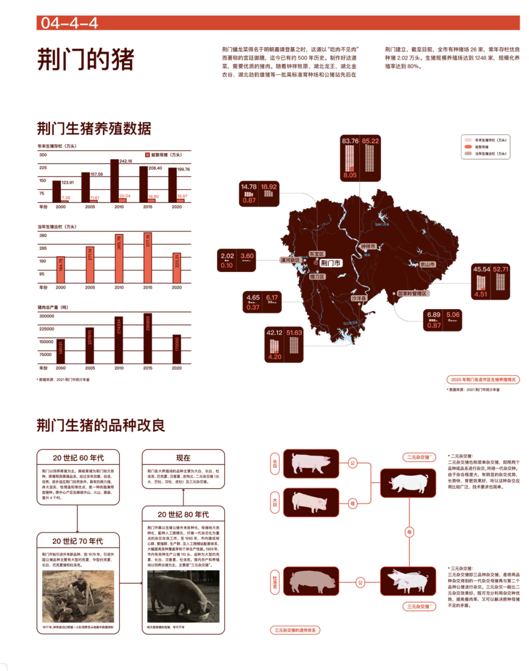 荆门市按照“稳产能、延链条、增效益”工作思路,统筹推进“一头猪”工程建设,生猪产业面貌发生了显著变化。钟祥牧原、湖北龙王、湖北金农谷、湖北劲豹雄猪等一批高标准育种场、公猪站先后在荆门建立。2022年,全市生猪存栏217.96万头,出栏生猪375.1万头。全市生猪规模养殖场达到1326家,规模化养殖率达到84%,高于全省20个百分点。