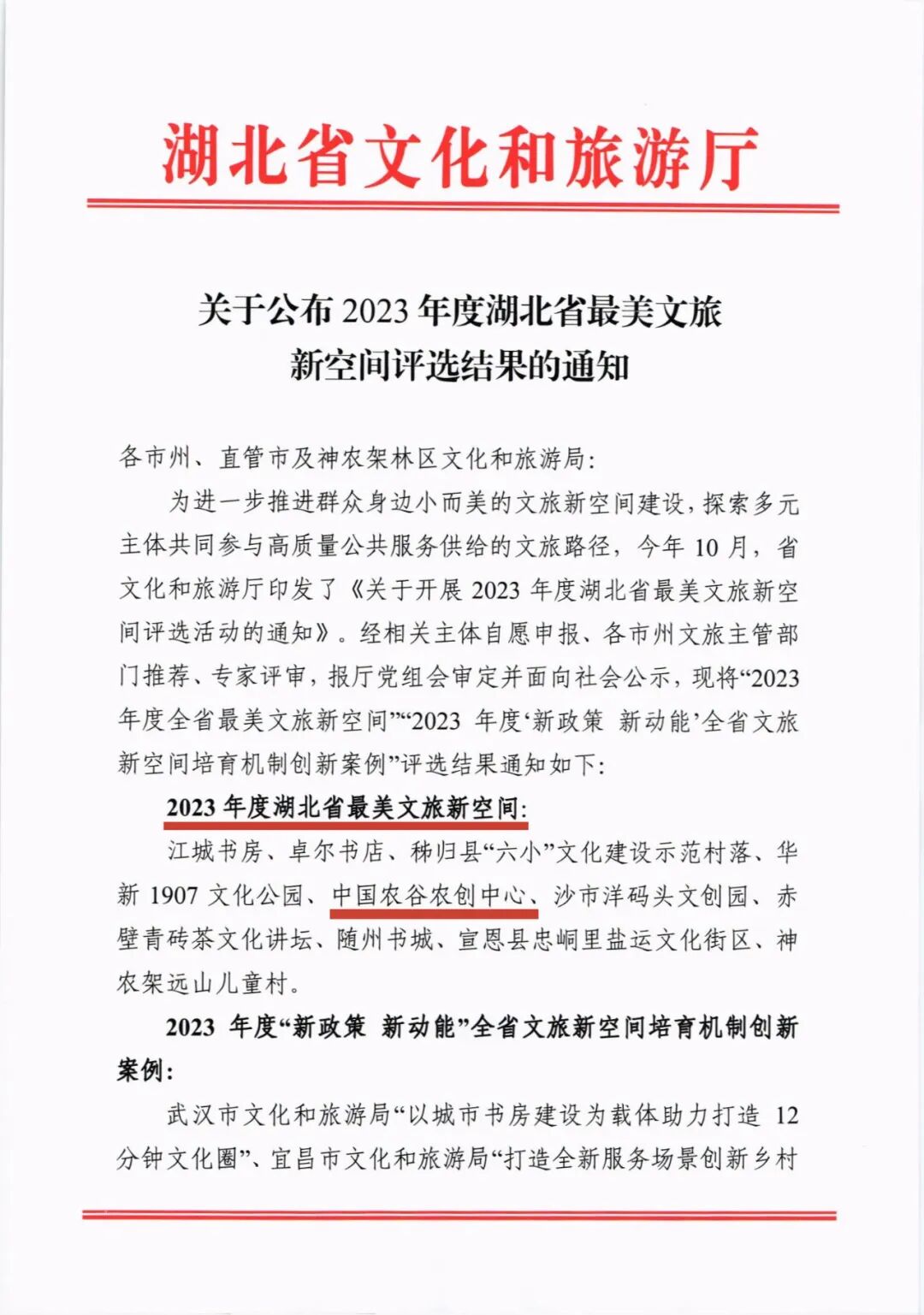 2023年12月14日,湖北省文化和旅游厅发布“2023年度湖北省最美文旅新空间”评选结果,中国农谷·农创中心成功入选,成为全省10个获奖项目之一!