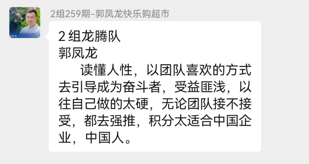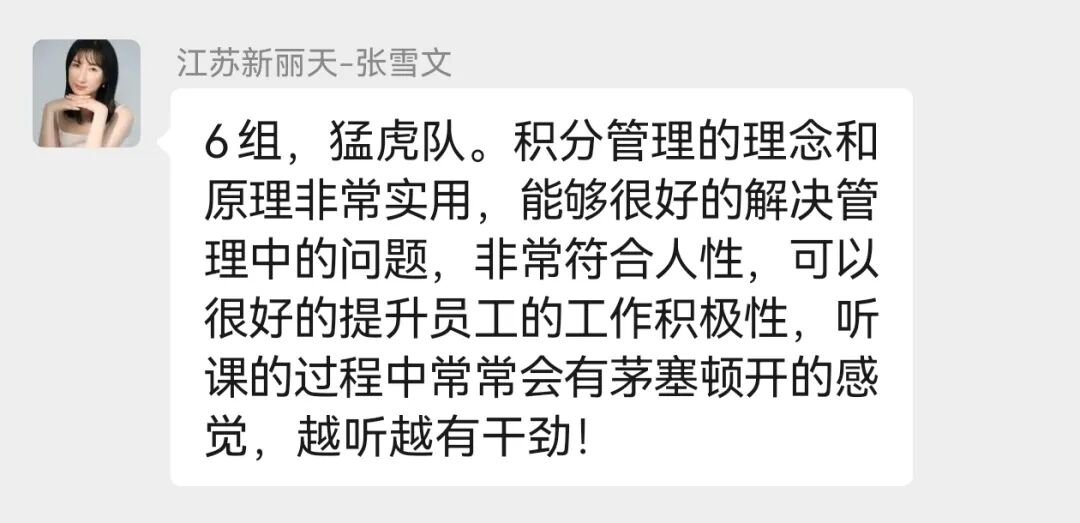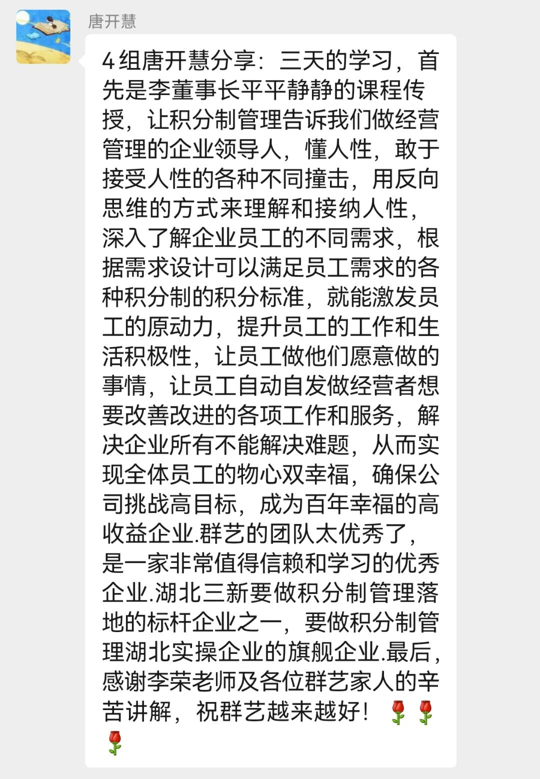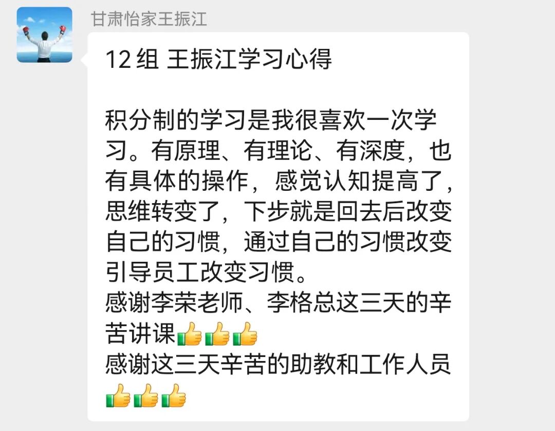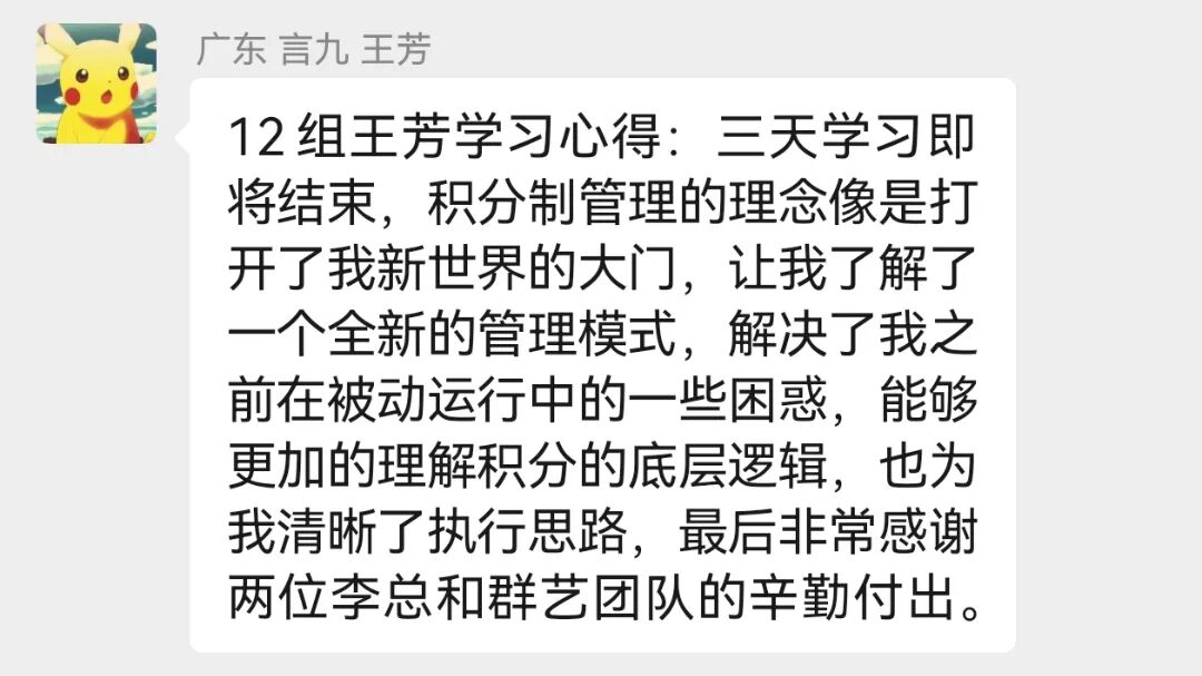 “此次来群艺学习,我收获颇丰。积分制管理制度让我对自己企业管理有了全新的理解。它不仅仅是一种管理工具,更是一种管理思想和管理文化。心情非常激动,回自己企业就立马实施落地。很感谢李荣老师的积分制管理落地实操班,让我在这里感受了一种不一样的管理体验,很喜欢这种模式。再一次感谢李荣老师、各位分享的老师和助教。”