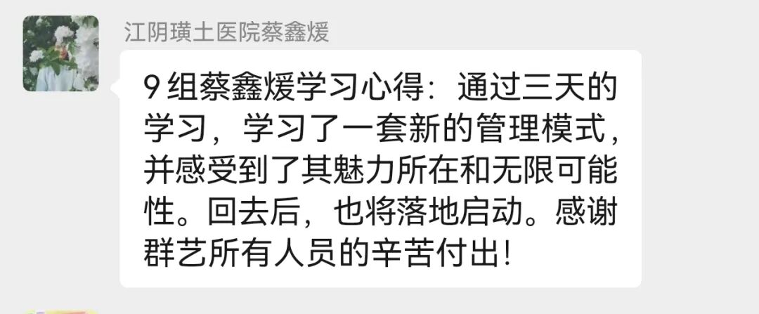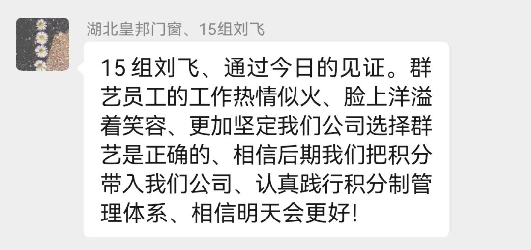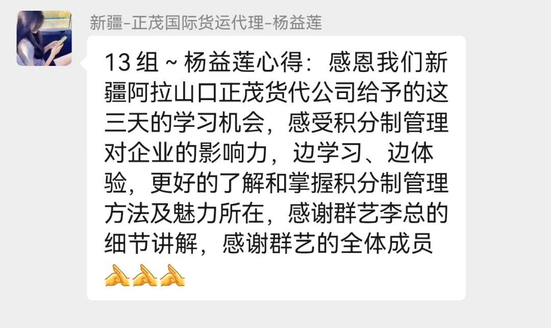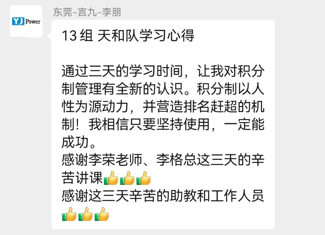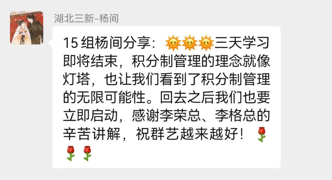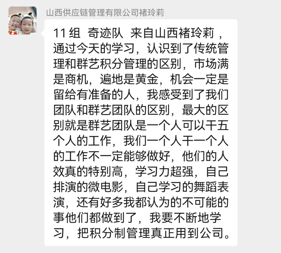 “此次来群艺学习,我收获颇丰。积分制管理制度让我对自己企业管理有了全新的理解。它不仅仅是一种管理工具,更是一种管理思想和管理文化。心情非常激动,回自己企业就立马实施落地。很感谢李荣老师的积分制管理落地实操班,让我在这里感受了一种不一样的管理体验,很喜欢这种模式。再一次感谢李荣老师、各位分享的老师和助教。”