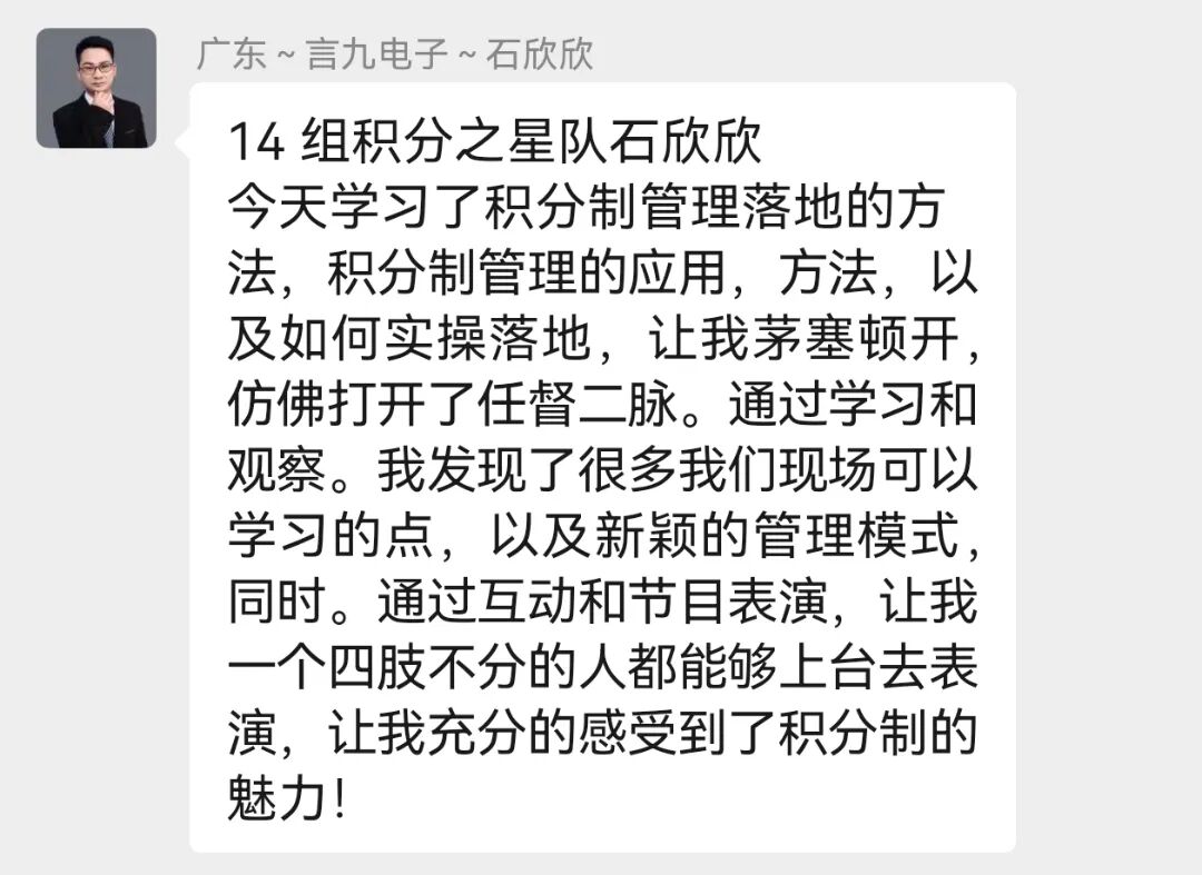 “积分制管理制度是可以从过程、结果、制度内外等多维度记录员工行为的银行,让员工做了不白做,调动员工原动力。很好!”