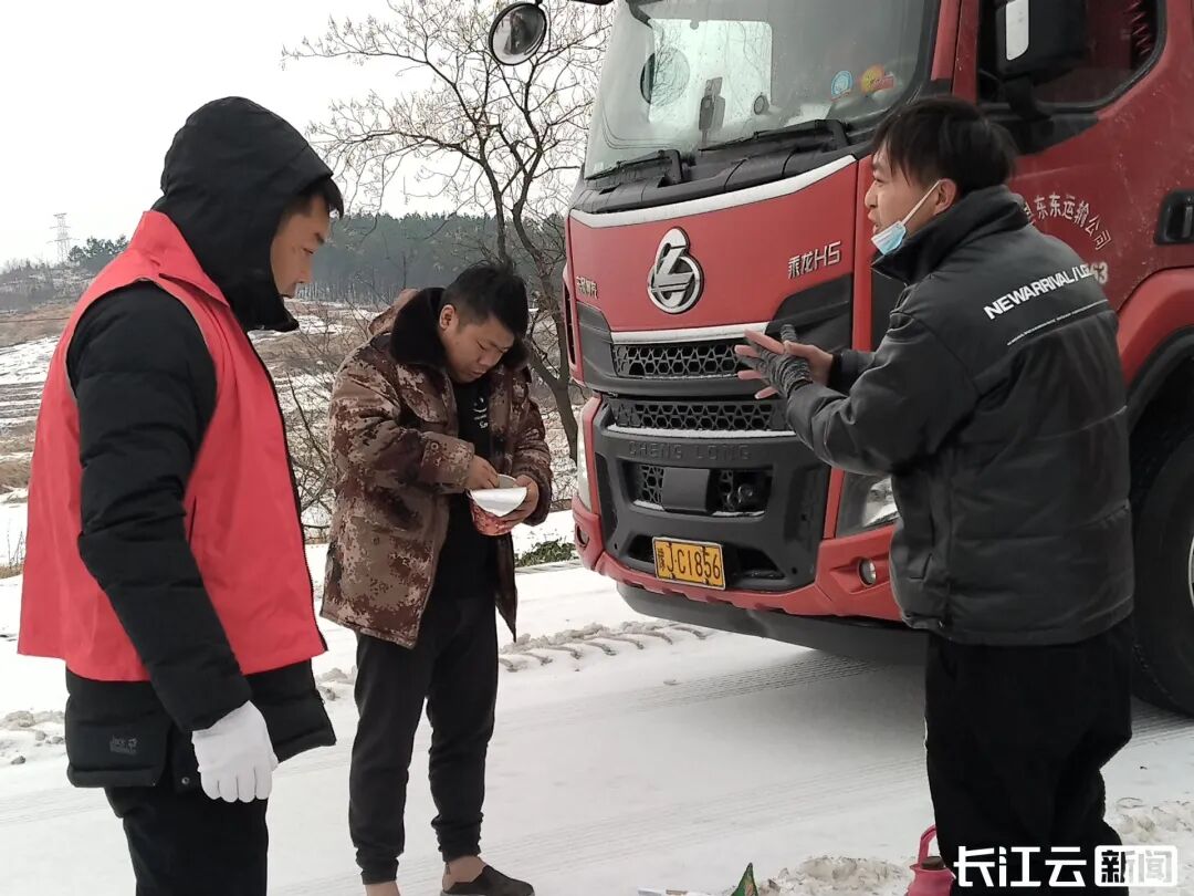 沿路群众自发送来开水,河口村群众张文崇带领儿子参与到镇里组织的志愿送暖活动中,东风村副主任李光波开着自家面包车到超市购买一车方便面、矿泉水、面包、饼干、牛奶等及时发放,截至上午10点,107国道孝昌王店段北向恢复通行。工作人员、志愿者还在紧急开展融雪除雪工作,尽全力保障道路全部通畅。