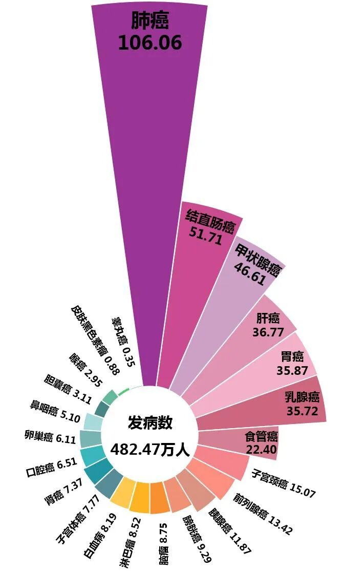 国家癌症中心发布数据显示,2022年我国恶性肿瘤新发病例为482.47万,发病率排名前十的癌种分别为:肺癌、结直肠癌、甲状腺癌、肝癌、胃癌、乳腺癌、食管癌、子宫颈癌、前列腺癌、胰腺癌。总体上男性发病率高于女性,肺癌发病率居首位。