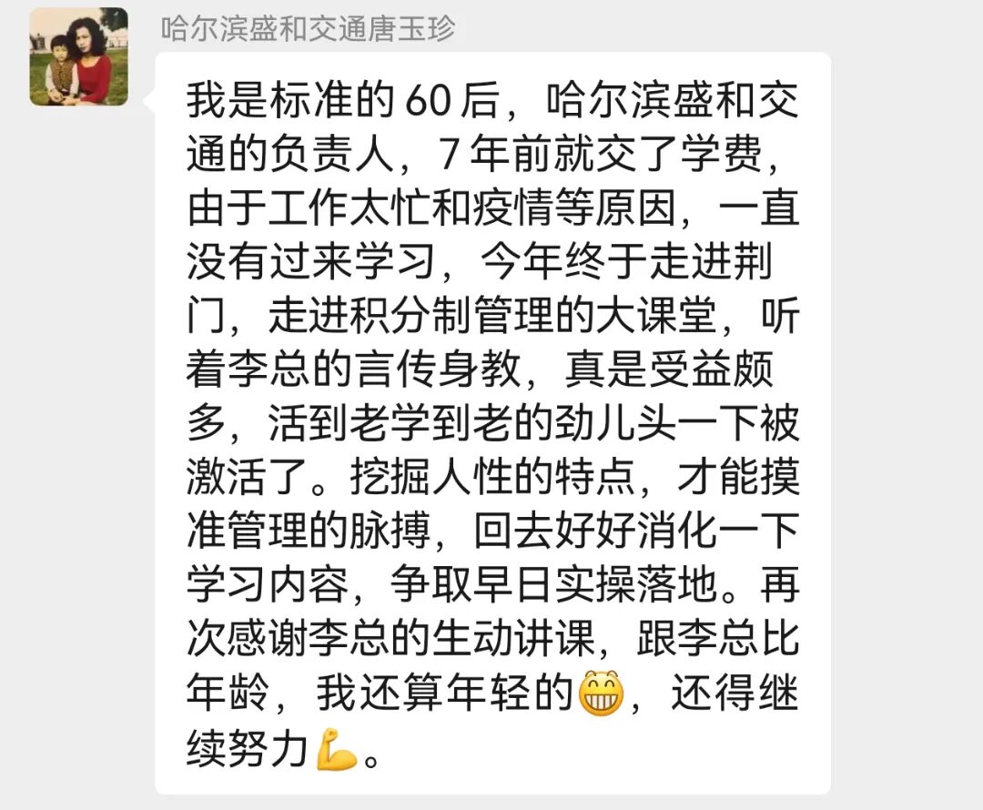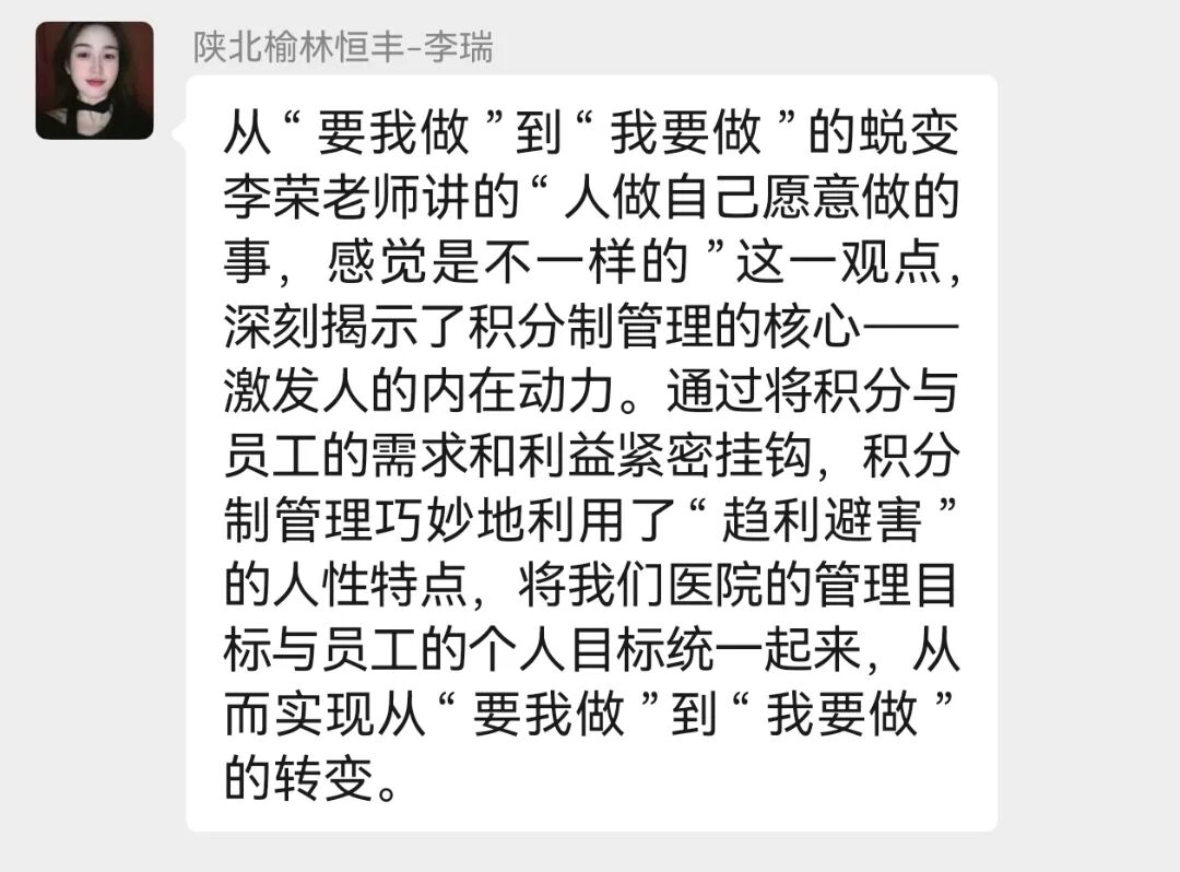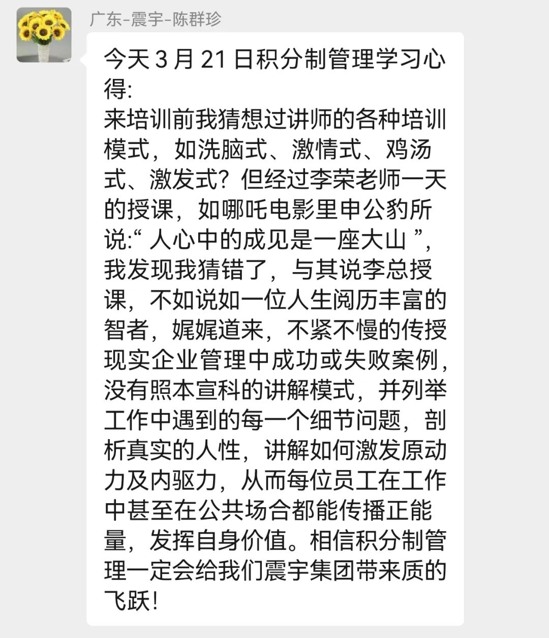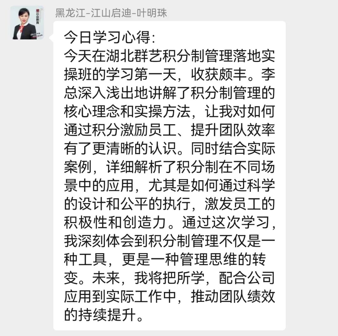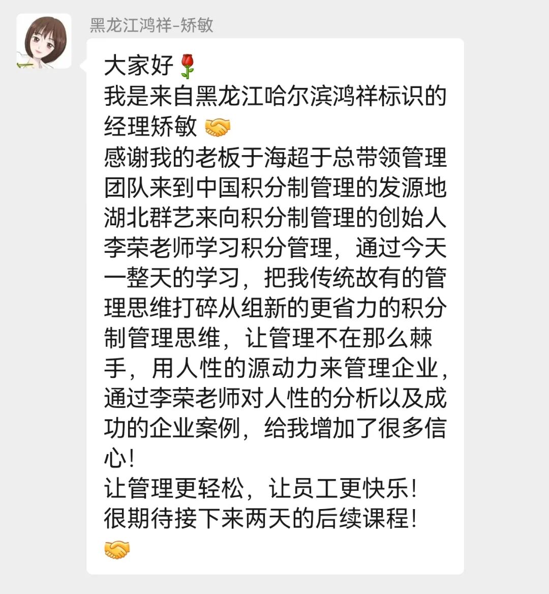 “通过3天的学习,让我更加深刻地感受到群艺李荣老师独创的"积分制管理"的强大技能!使我更加坚定地信任导入“积分制管理”会给公司带来发展的憧憬目标。让公司的发展有了底气!”