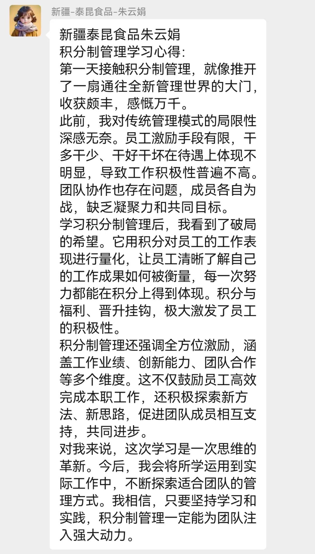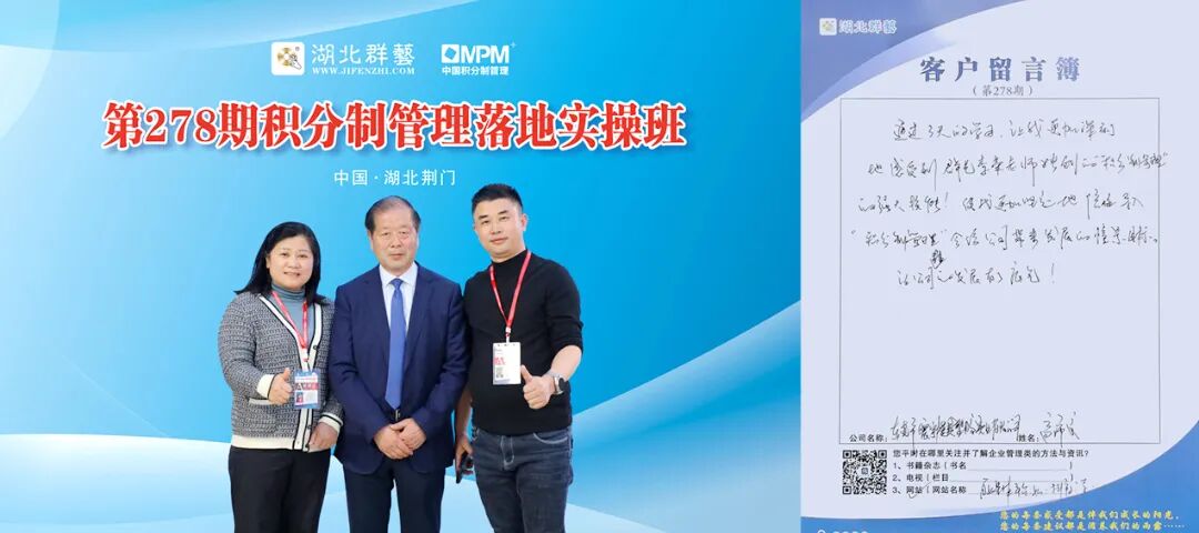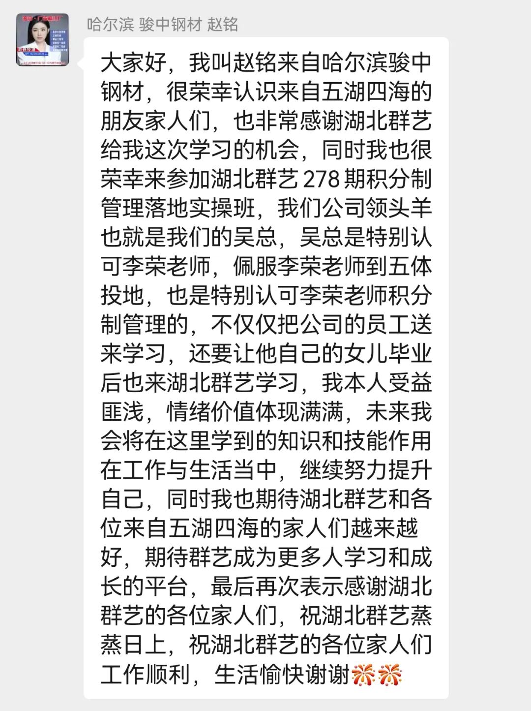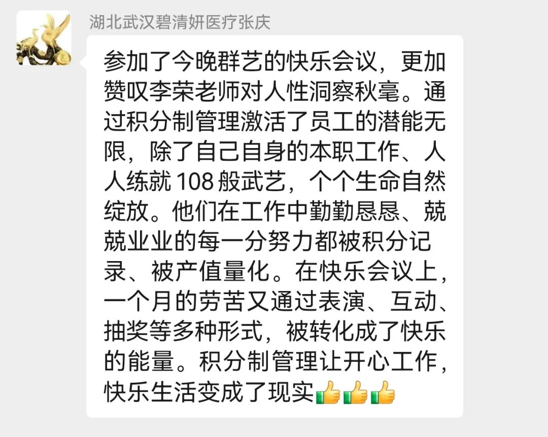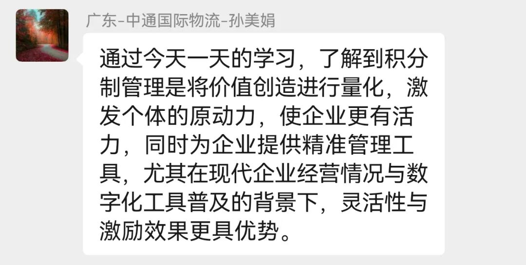 “通过3天的学习,让我更加深刻地感受到群艺李荣老师独创的"积分制管理"的强大技能!使我更加坚定地信任导入“积分制管理”会给公司带来发展的憧憬目标。让公司的发展有了底气!”