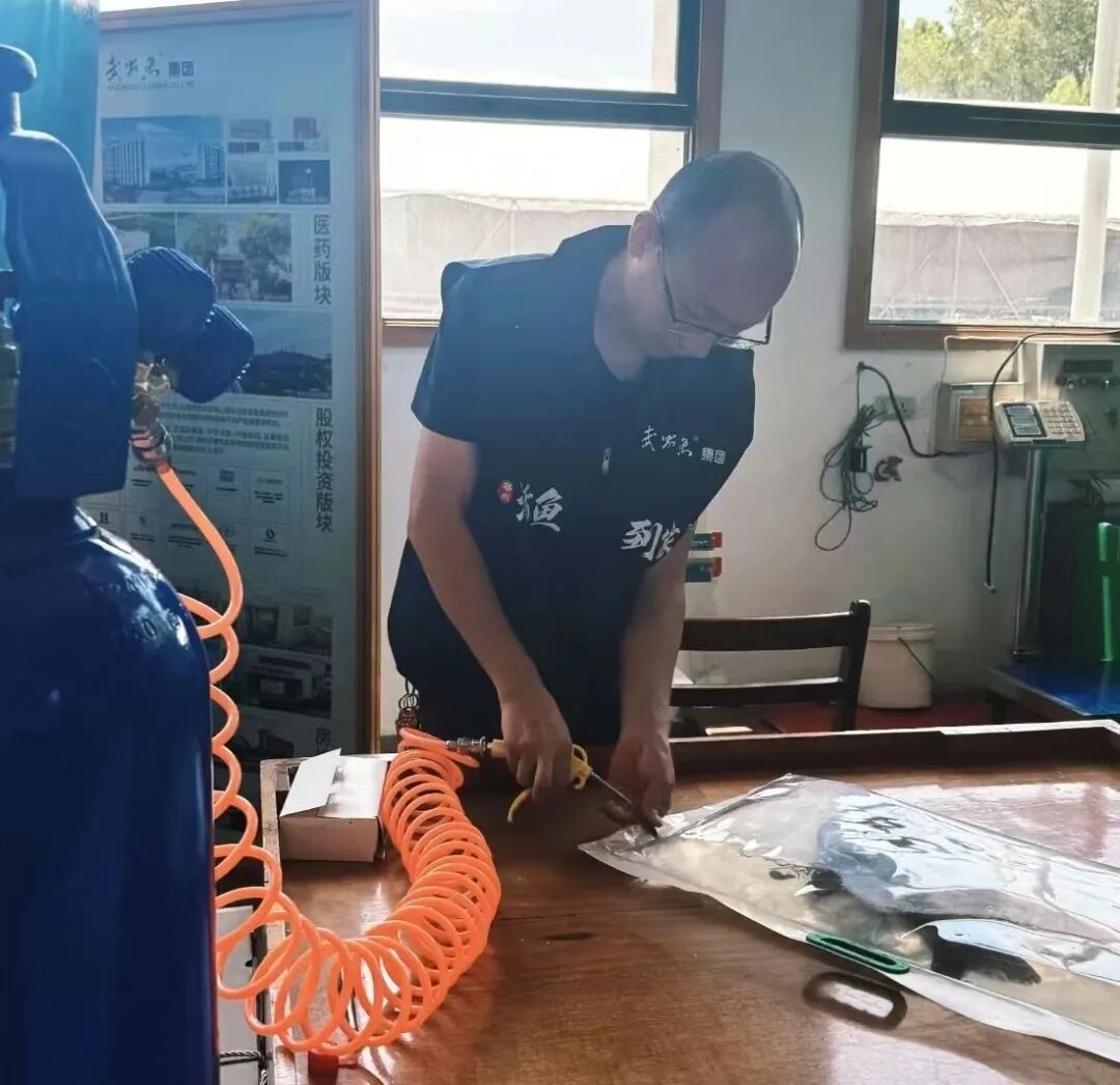 工作人员给装着武昌鱼的包装袋注氧、密封