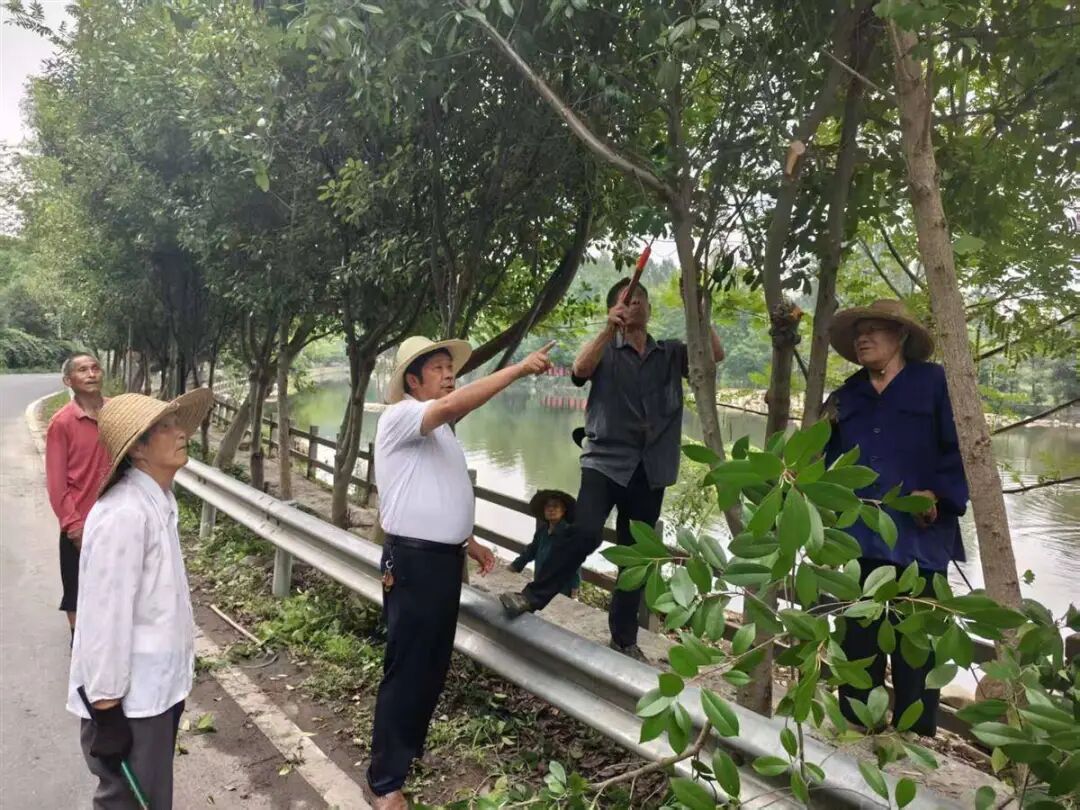 6月30日清晨,堰河村的晨会从会议室搬到了村道旁,村里正修剪影响旅游观光的树枝,闵洪艳带着村干部现场办公。