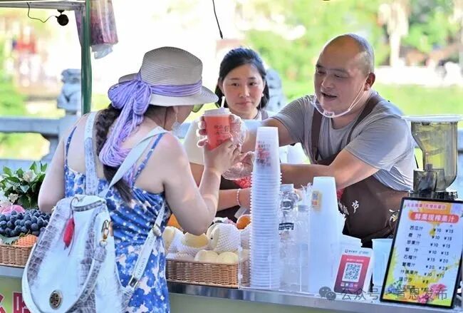 不到8分钟,游客徐前进和家人们便拿到了冰镇甜酒西瓜,给汪华珍扫码支付了42元后,他赶紧喝了一大口,夏日的炎热和吃完烤活鱼的油腻感瞬间被冲散,让徐前进赞不绝口。“这条街很有意思,不仅可以露天吃烤活鱼,街上的小吃也很丰富,很有人气。”