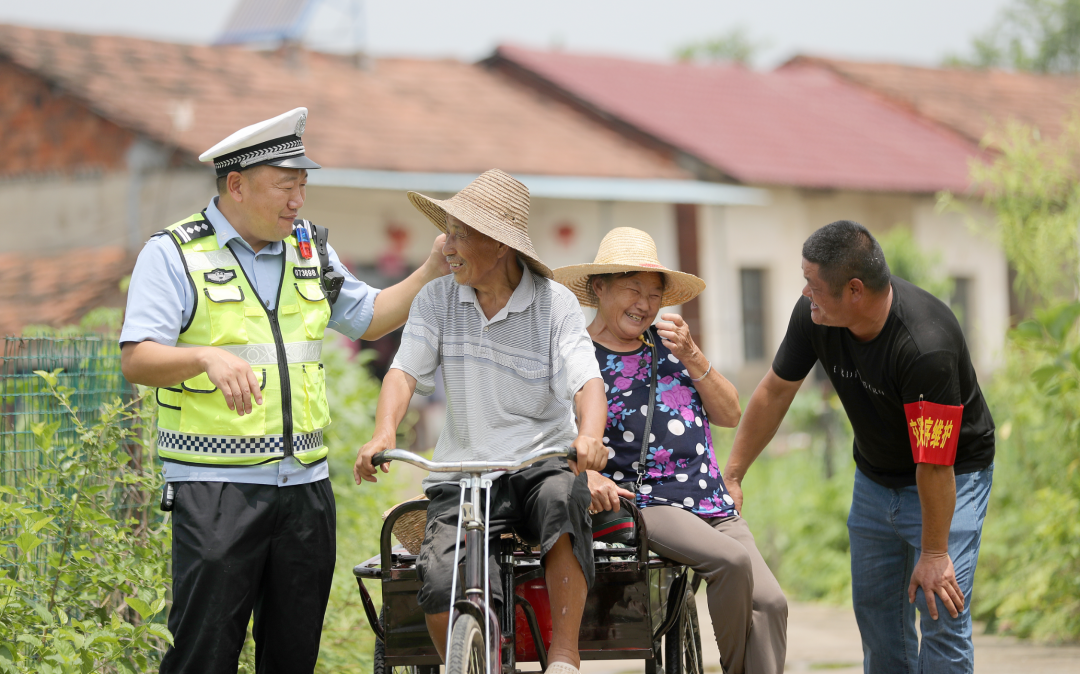 民警与志愿者,在乡间道路向村民开展交通安全宣传。