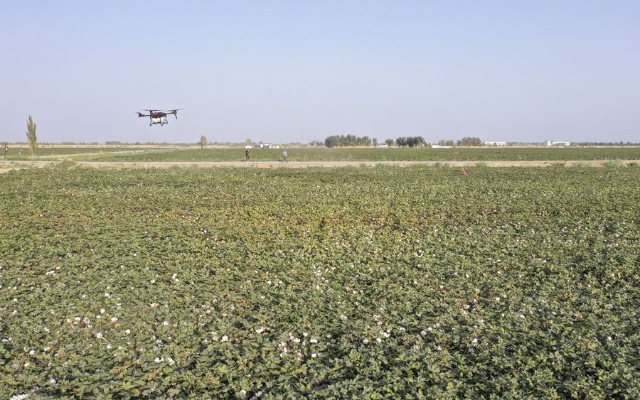 在新疆尉犁县兴平镇达西村一处高标准农田,种植户用无人机喷洒脱叶剂(2022年9月20日摄,无人机照片)。新华社发(汪志鹏 摄)