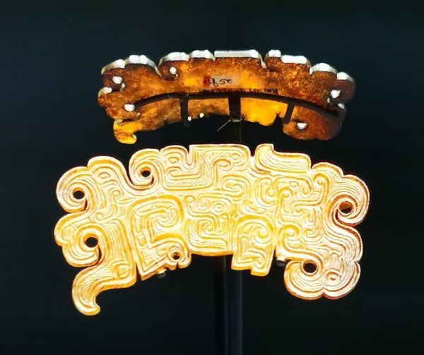来自河南南阳的一对龙凤纹玉龙,刻画了龙凤呈祥的美好图景。这对春秋时期的玉器,由一块黄色透闪石精雕细刻而成,雕镂完成后对剖为二。其图案构思奇巧,中有一龙,玉龙边缘刻出5个凤首,龙凤之间祥云盘绕,构图和谐,色泽温润。