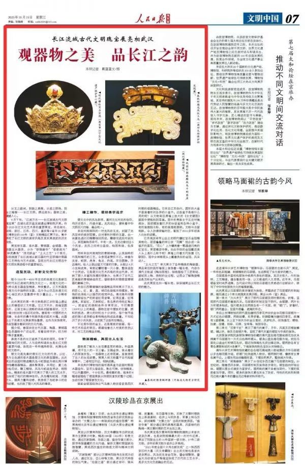 9月下旬,“江流万古——长江流域古代文明瑰宝展”在湖北武汉盘龙城遗址博物院开展。作为2025长江文化艺术季的重要展览,来自湖北、湖南、浙江、江苏、四川、重庆等9省市30多家文博单位的160件(套)文物精品汇聚于此,集中展现了长江文明的美学风格及其发展流变的历史脉络。