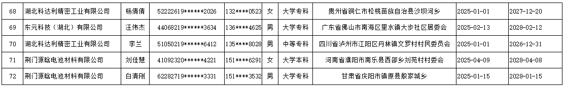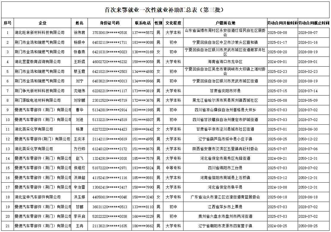 根据《省人民政府办公厅关于 加快建设高质量人力资源市场体系的实施意见》(鄂政办发〔2023〕15号)、《市人民政府办公室印发关于更好服务市场主体推动经济稳健发展政策措施的通知》(荆政办发〔2023〕19号)等文件精神,经区人社局、区就业中心联合审核,拟对徐伟君等72名审核通过的企业职工发放首次来鄂一次性就业补助,现将拟发放名单及金额予以公示(名单附后)。公示时间为7天(2025年10月15日至10月21日),公示期间,欢迎社会各界和广大市民对公示内容予以监督,发现问题可通过来访、来电、来信等方式向我中心反映。