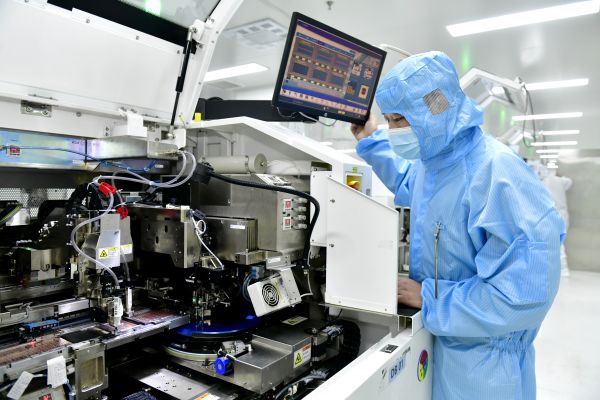 2025年2月13日,在山东一家电子有限公司,工作人员在生产线值守。新华社记者 郭绪雷 摄
