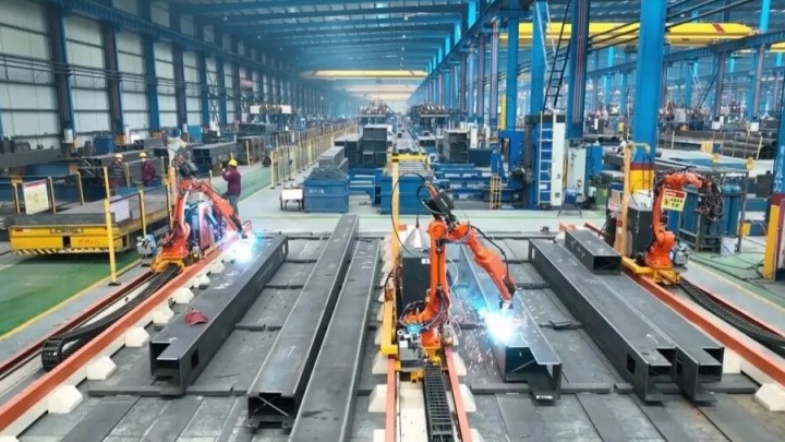 在团风县鸿路钢结构生产车间,智能焊接机器人正挥舞机械臂,电弧闪烁间,钢结构构件的焊缝平滑如镜。