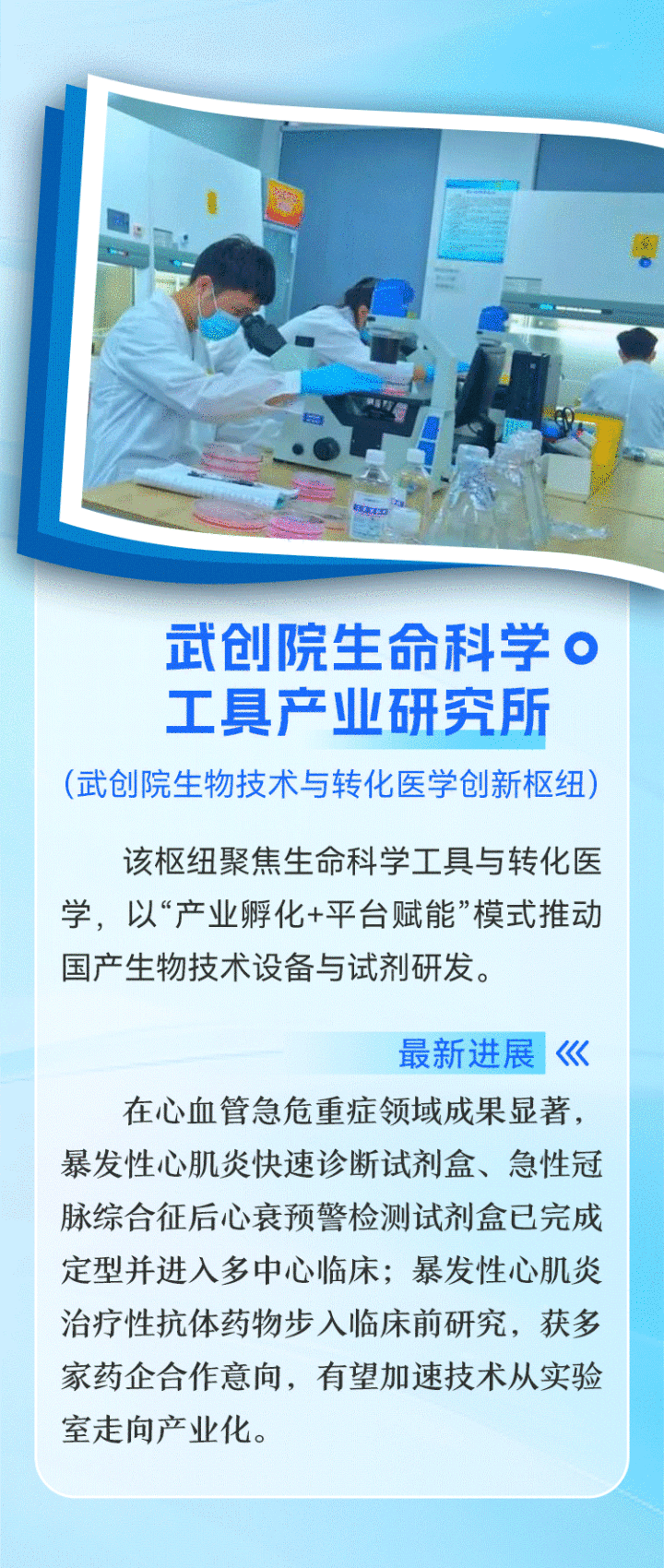 今年4月,武创院生命科学工具产业研究所升级为武创院生物技术与转化医学创新枢纽,以心血管疾病诊疗,推动顶尖项目转化。由同济医院汪道文教授团队研发的暴发性心肌炎快速诊断试剂盒、由北京安贞医院李玉琳教授领衔的急性冠脉综合征后心衰预警检测试剂盒等两款产品,都已经陆续启动多中心临床试验,有望快速获批医疗器械注册证。