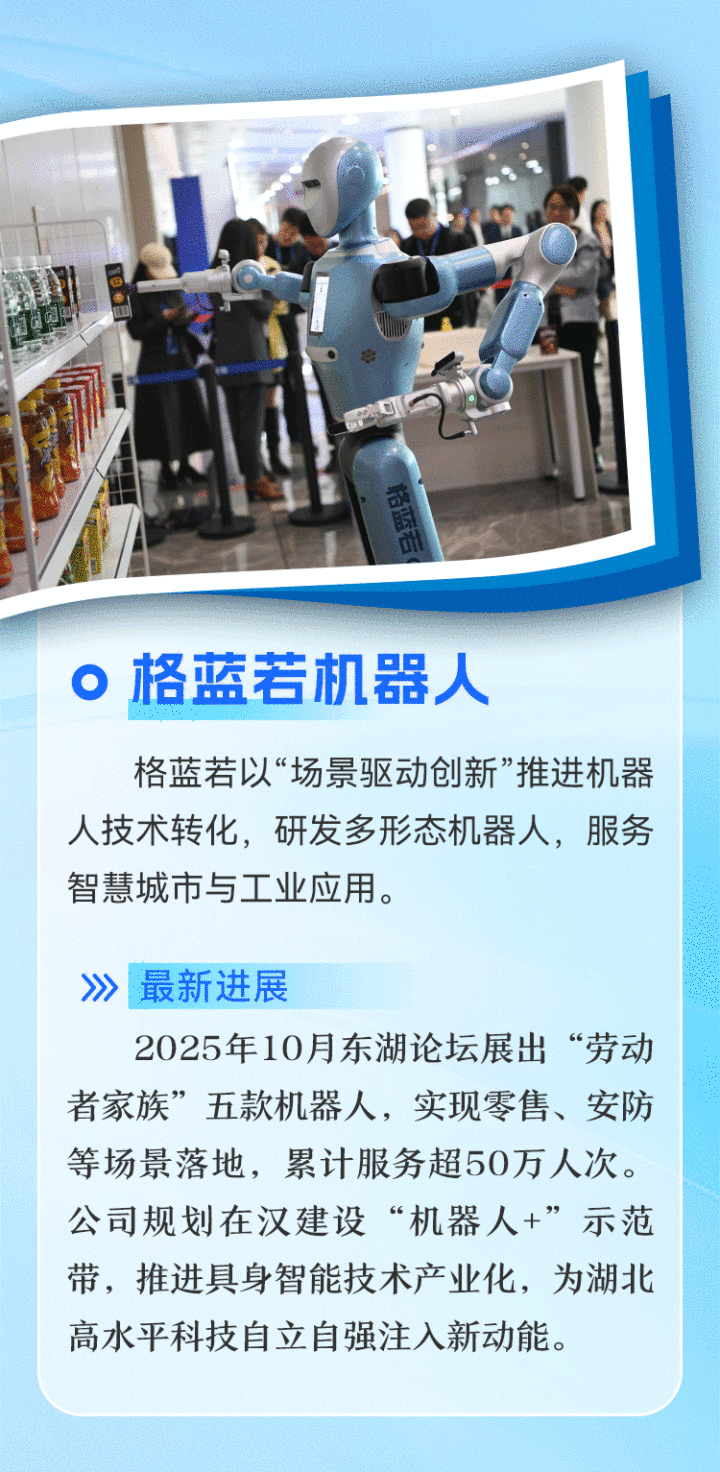 以场景驱动创新,武汉格蓝若智能机器人有限公司近期成果频现。其自主研发的“劳动者家族”系列机器人已在汉口火车站等场景投入应用,累计服务超50万人次。公司正规划在武汉建设“机器人+”应用示范带,让智能服务覆盖更多场景。