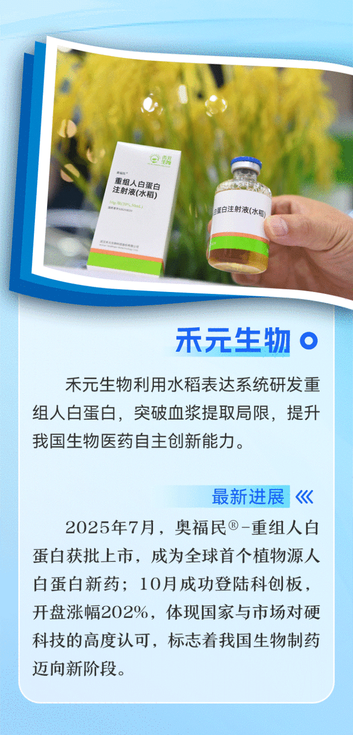 今年7月,武汉禾元生物科技股份有限公司历经20年研发的奥福民®-重组人白蛋白(水稻)获批上市,这是全球首个植物表达体系的重组人白蛋白,实现了该领域“从0到1”的重大突破。10月,禾元生物成功登陆科创板,成为“重组人白蛋白第一股”,开盘涨幅202%,彰显了市场高度认可。