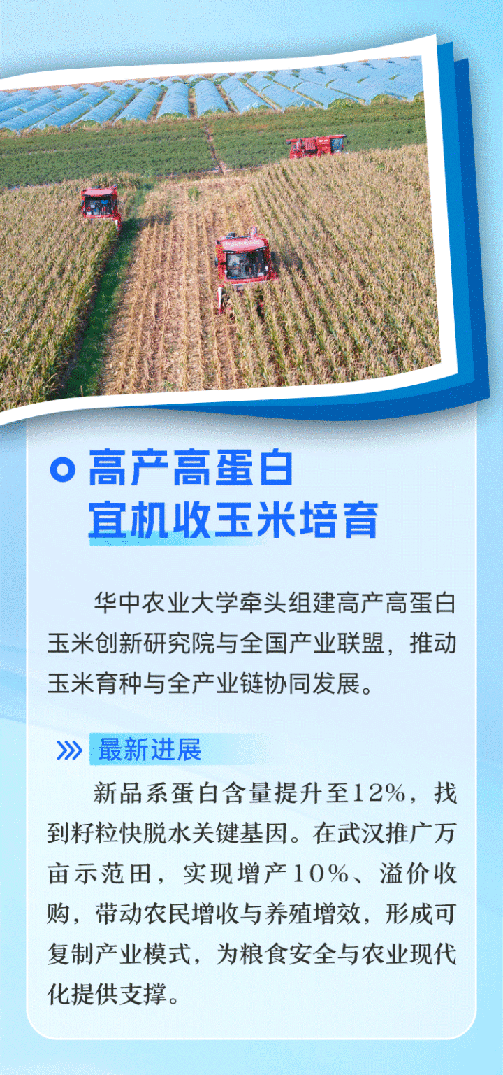 在广袤田野,科技创新同样结出硕果。华中农业大学联合多方成立高产高蛋白玉米创新研究院及产业联盟,构建了从品种研发到种植、饲料应用的全产业链闭环。今年8月,万亩高蛋白玉米喜获丰收,在增产10%的同时,因蛋白质含量高出普通玉米2个百分点,被养殖企业溢价30—60元/吨收购,带动农民增收、产业增效。