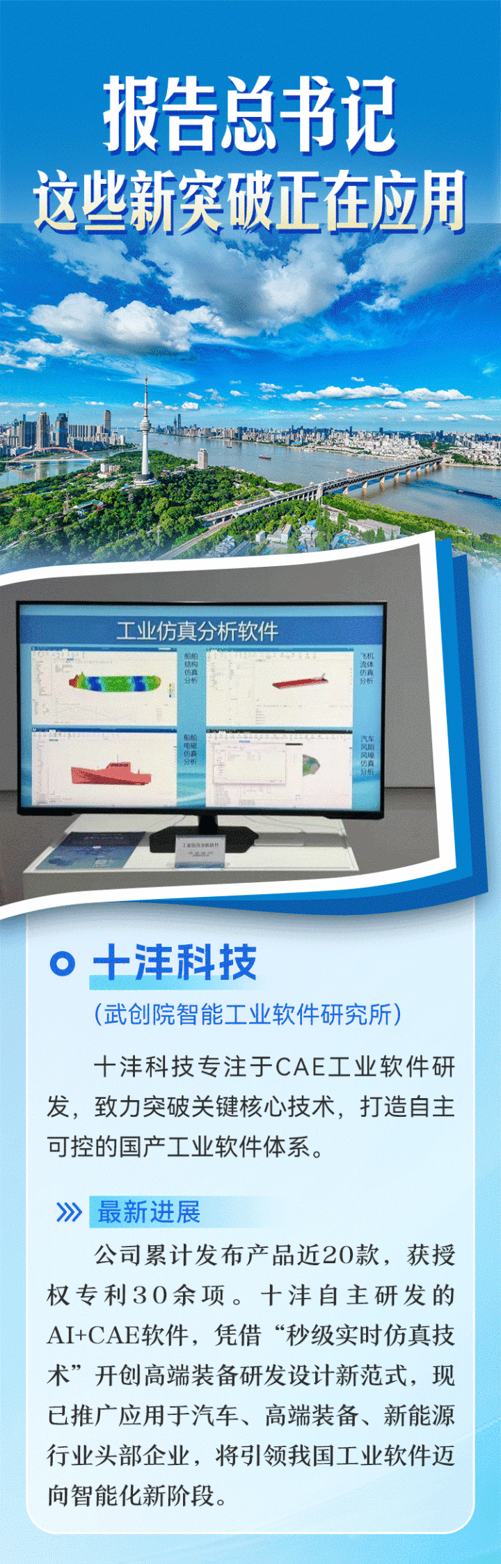 依托武创院智能工业软件研究所,十沣科技潜心攻关,累计发布近20款产品,获授权专利30余项,已发展成为国内实力领先的CAE软件厂商之一。同时,牵头承担了科技部颠覆性技术创新专项“AI-CFD一体化通用仿真软件”,并拓展与多个龙头企业的合作。
