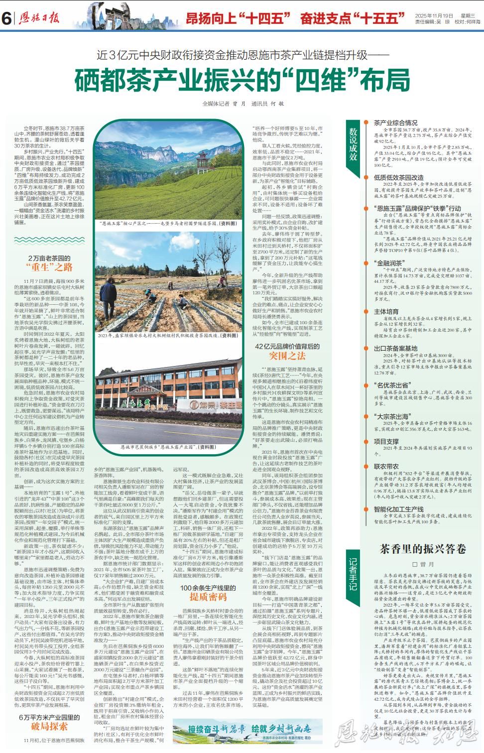 乡村振兴,产业先行。“十四五”期间,恩施市农业农村局积极争取中央财政衔接资金,通过“茶园提质、厂房升级、设备迭代、品牌焕新”四维布局持续发力,成功完成2万亩低质低效茶园焕新升级,建成6万平方米标准化厂房,更新100余条连续化智能化生产线,将“恩施玉露”品牌价值推升至42.72亿元。