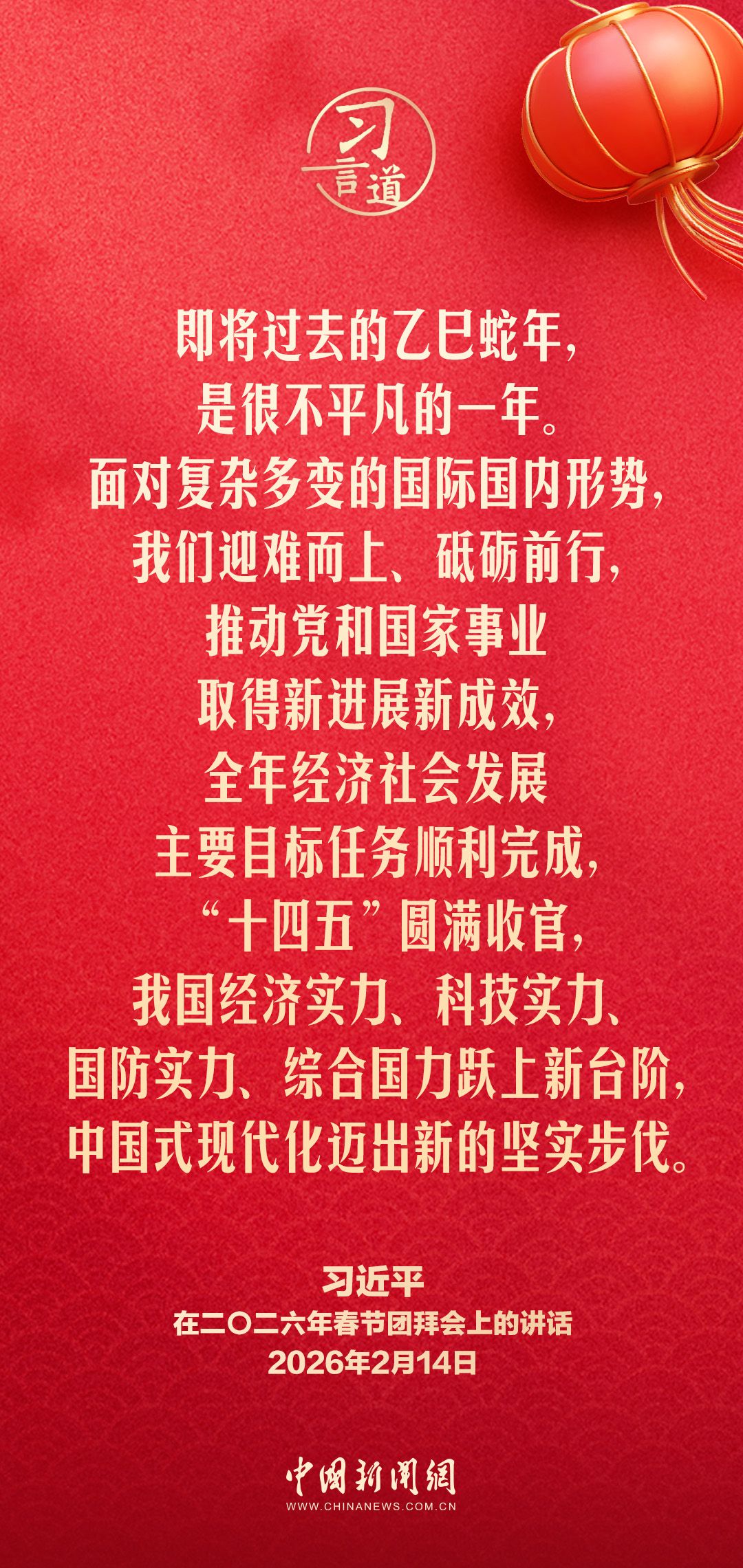 2月14日,中共中央、国务院在人民大会堂举行2026年春节团拜会。中共中央总书记、国家主席、中央军委主席习近平发表讲话,代表党中央和国务院,向全国各族人民,向香港特别行政区同胞、澳门特别行政区同胞、台湾同胞和海外侨胞拜年。他指出——