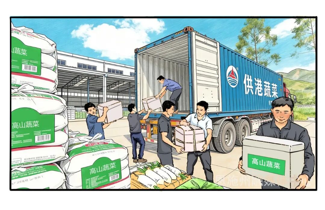 9月15日,陈保庆来田卫东家串门时,特意从车上搬下一个泡沫箱。打开箱盖,里面整齐码放着萝卜、菜心,都带着高山冷凉气候特有的鲜灵劲。陈保庆给田卫东介绍,“这些和直供香港的高山蔬菜是一样的。现在鹤峰高山供港蔬菜直发可不得了,全程冷链,恒温4℃运输,今天清晨采摘的,明天上午就能摆上香港西贡区新都城商场‘好抵食’菜档了。”