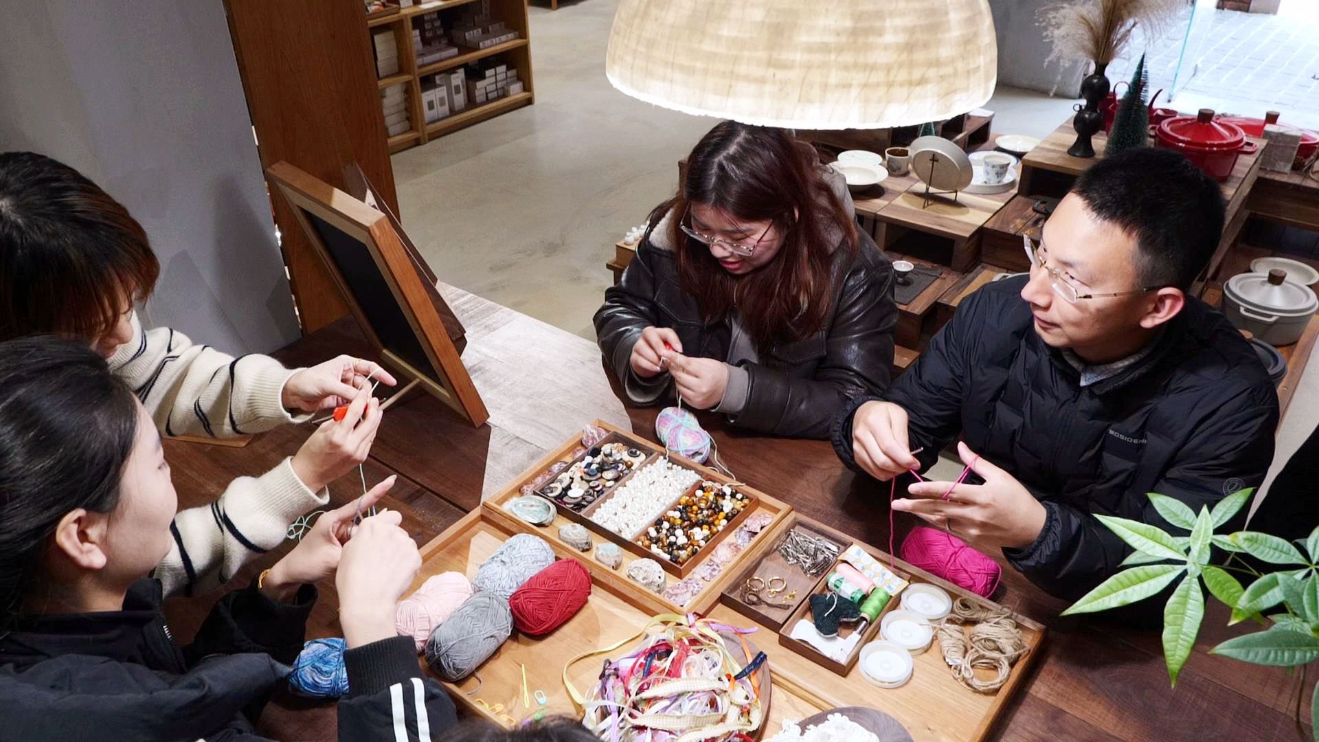 一边是奔跑的脚步,一边是慢下来的时光。就在赛道不远处,延庆里的红砖墙下,一场樱花主题的编织活动正在一个叫做 “新造”的小店进行。几个年轻人围坐在一起,指尖翻飞,把武汉的春天留在手中的樱花上。一家店,一场春日聚会,让这座九十多岁的老里份,有了不一样的温度。