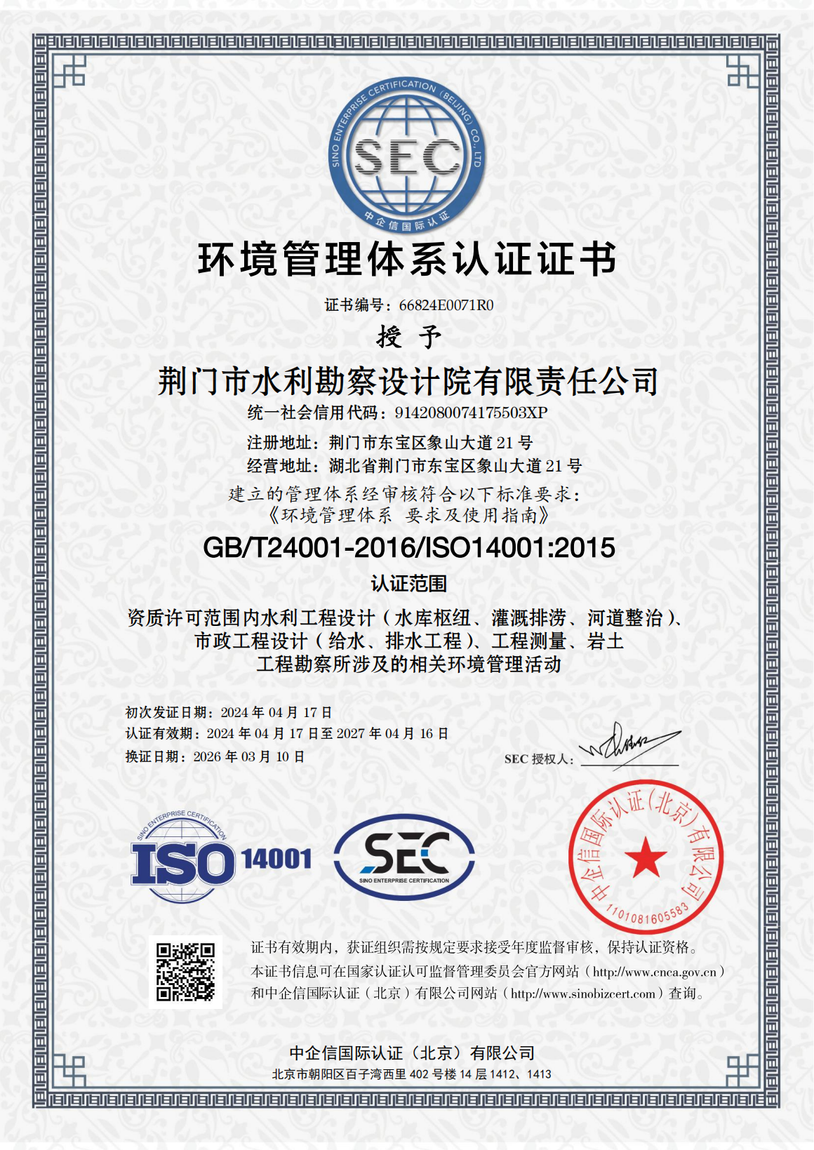 近日,市水务集团下属子公司荆门市水利勘察设计院有限责任公司(以下简称“水勘院”)顺利通过QES(质量、环境及职业健康安全)三体系再认证审核,并新增市政工程设计(给水、排水工程)认证范围,这标志着水勘院从水利工程向市政水务工程领域迈出了实质性的一步。