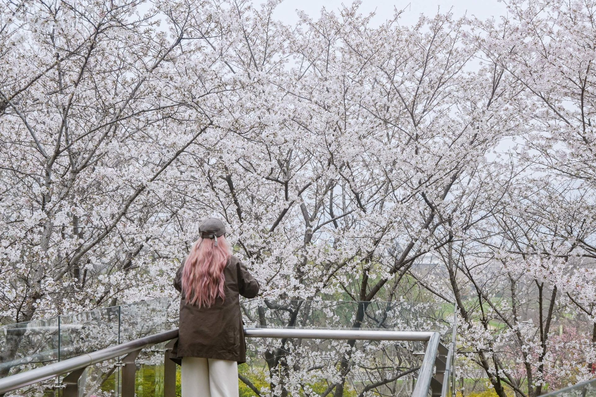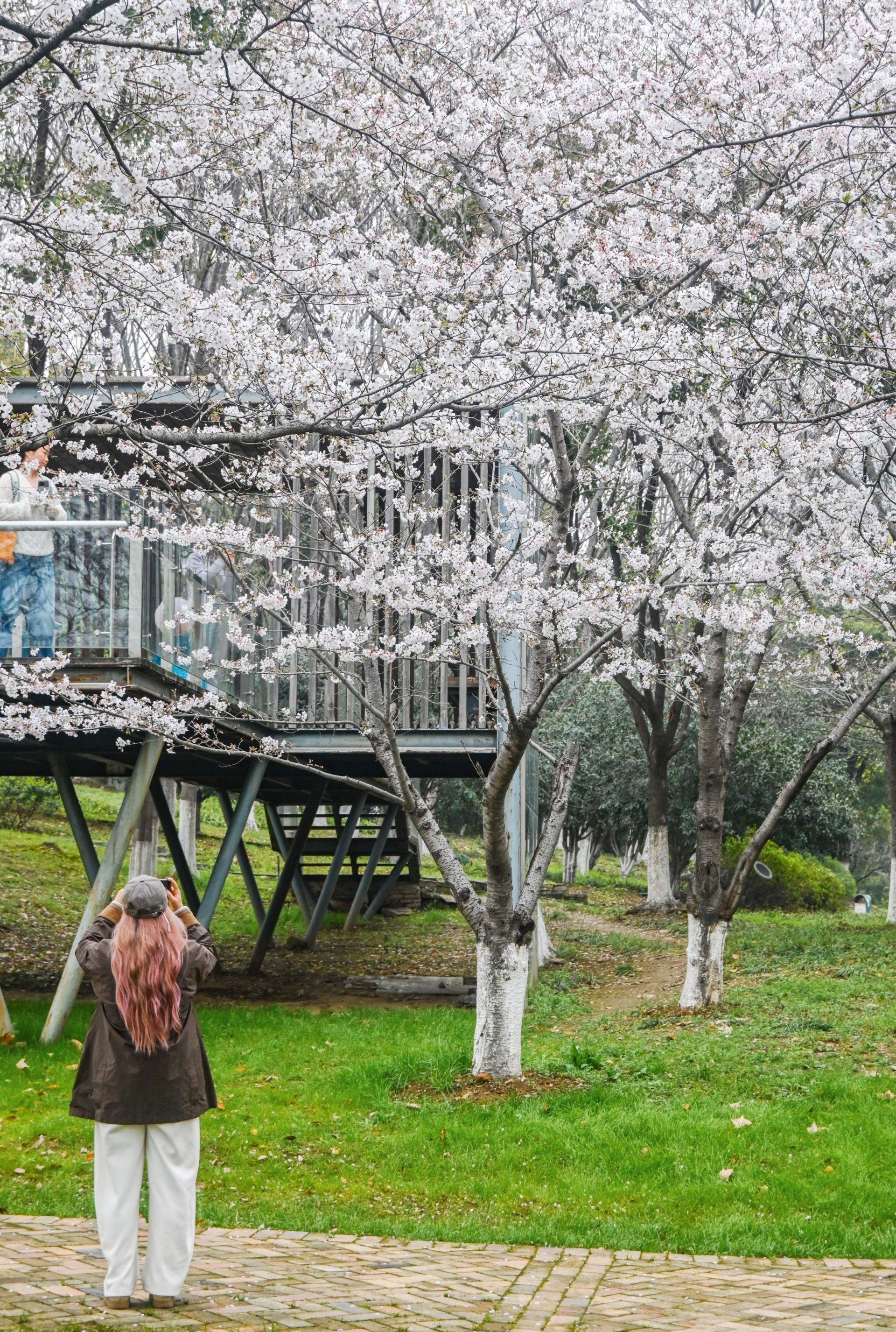到了三月初,“粉色旋风”席卷江城。光谷广场的绿化带、龟山公园的半山腰、汉口江滩的秋千旁、汉正街的地铁口……航拍视角堪比AI特效。开得最猛的当数光谷星河附近的绿化带,200株樱花树是今年连夜种下的,以早、中樱花品种为主,没想到首开就爆花了。“摩天大楼间长出一片粉雾海,震撼又魔幻”,有游客说。