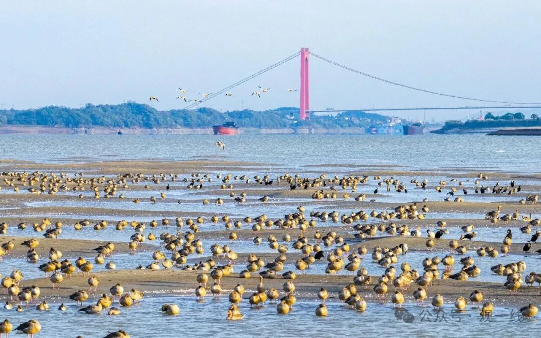 长江黄石段,成群候鸟在江面觅食(薛婷 | 摄)