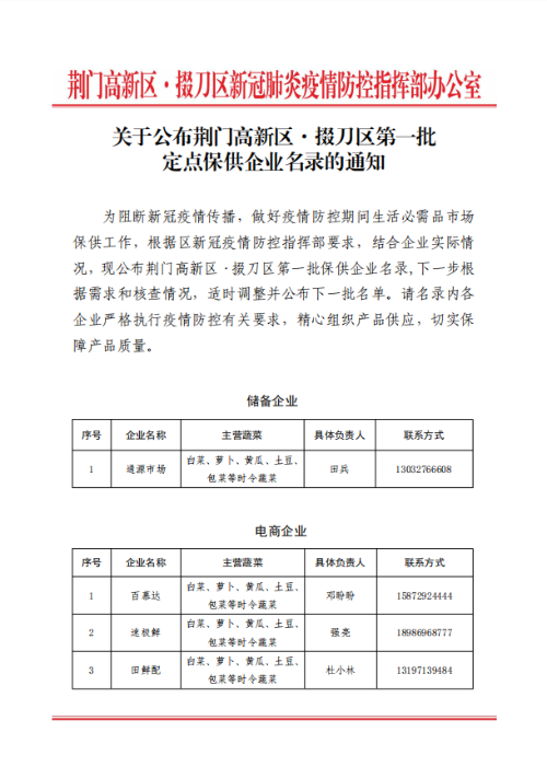 关于公布荆门高新区·掇刀区第一批定点保供企业名录的通知